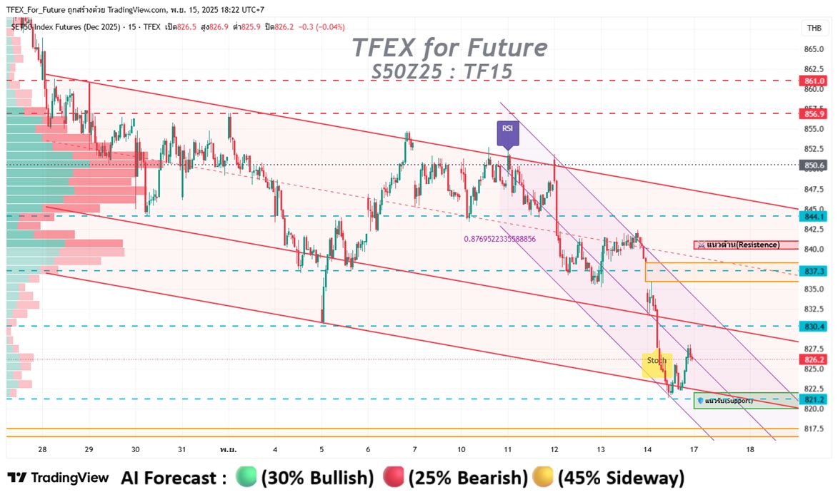 หากหลุด 821–820 จะเป็นการ “หลุดฐานรอบล่าสุด” และเทรนด์ลงอาจเร่งต่อ