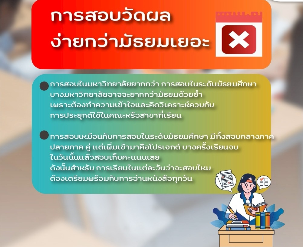 ความจริง: การสอบในมหา'ลัย ยากกว่ามัธยม เพราะเน้นการคิดวิเคราะห์ ประยุกต์ใช้ และบางวิชาเรียนจบวันนั้น สอบเก็บคะแนนวันนั้นเลย!
