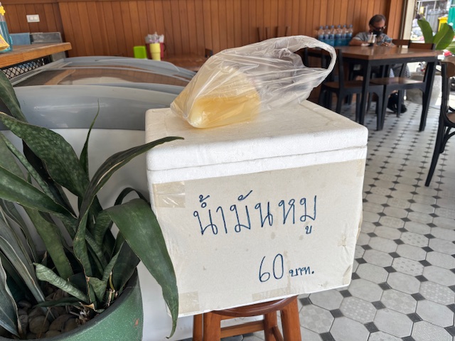 ผมใช้น้ำมันหมูที่นี่ ถ้าไม่ได้เจียวเอง น้ำมันหมูถ้าเอาไปทอดไข่เจียว ถือว่าเป็นที่สุดนะครับ