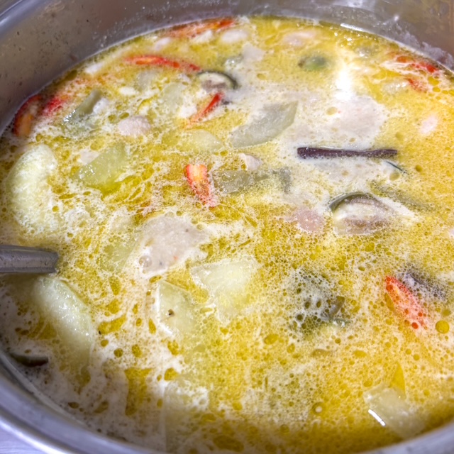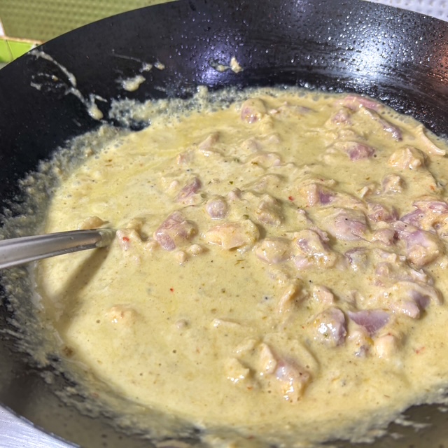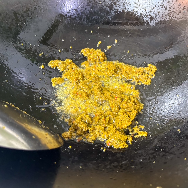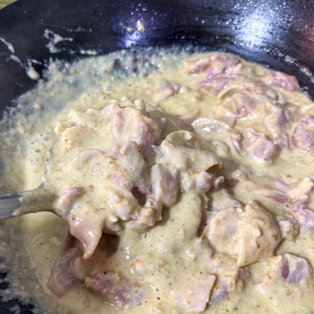 ผัดเครื่องแกงกับน้ำมันหมูที่ซื้อมา แล้วค่อยใส่หัวกะทิลงไปแล้วตามด้วยไก่ ลงไปผัด ผมเติมน้ำตาล น้ำปลาปรุงรสลงไป