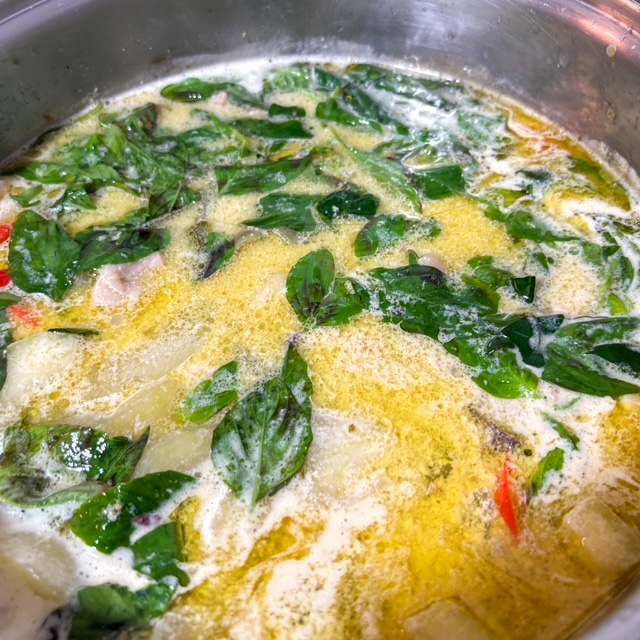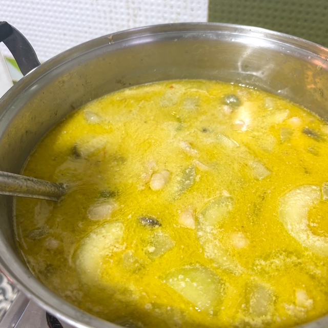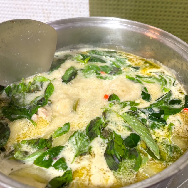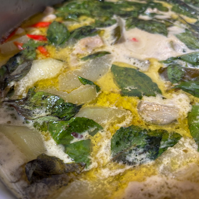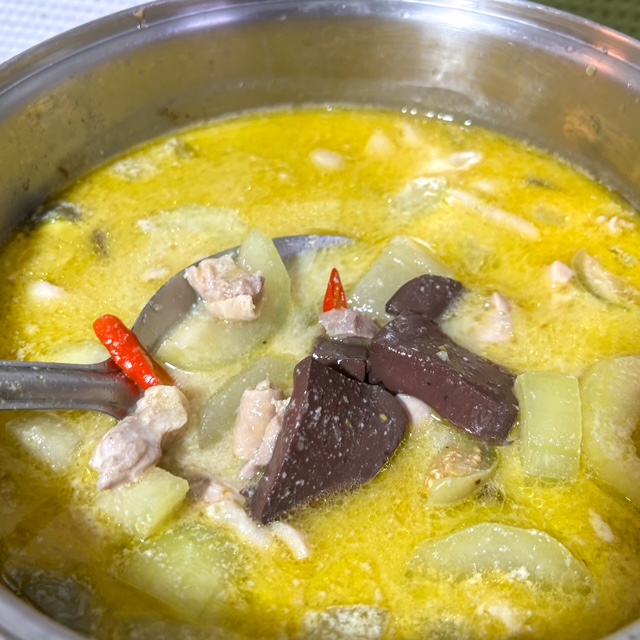 ตักใส่หม้อเติมหางกะทิลงไป ใส่ฟักตาม ปรุงรสตามชอบ ใส่เลือด สุดท้ายก่อนปิดไฟก็ใส่โหระพาลงไป