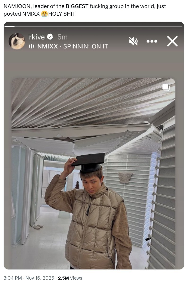 RM ลีดเดอร์วง BTS ได้ใช้เพลง "Spinni' on It" จากมินิอัลบั้มล่าสุดของ NMIXX มาประกอบในสตอรี่ ซึ่งให้เกิดปฏิกิริยาอย่างล้นหลามในโลกออนไลน์ โดยได้มี แอคเคาท์หนึ่งใน X ได้โพสข้อความว่า "โอ้โห นัมจุน หัวหน้าวงที่โคตรจะใหญ่ที่สุดในโลก เพิ่งโพสต์ถึง NMIXX" พร้อมรูปประกอบ ซึ่งทำให้มียอดวิวถึง 2.5 ล้านวิว เลยทีเดียว