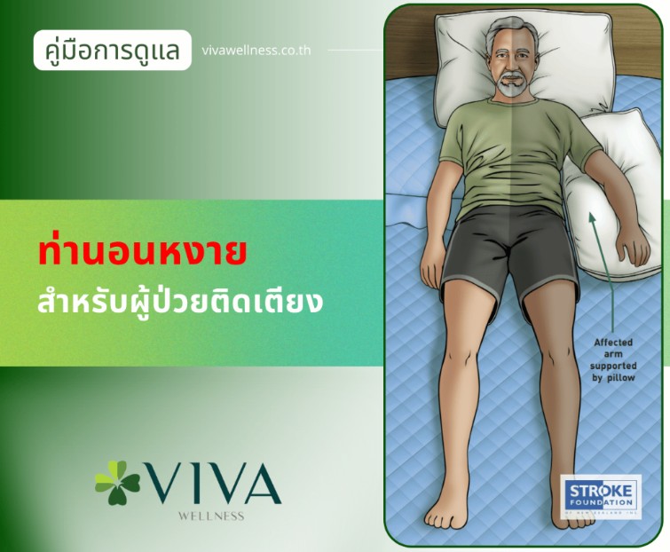 - ศีรษะหนุนอยู่บนหมอนใบเล็ก ๆ จัดหน้าให้ตรงหรือหันไปด้านที่เป็นอัมพาต ให้สังเกตดูว่าท่านั้น ผู้ป่วยสามารถนอนตรงหายใจได้สะดวก