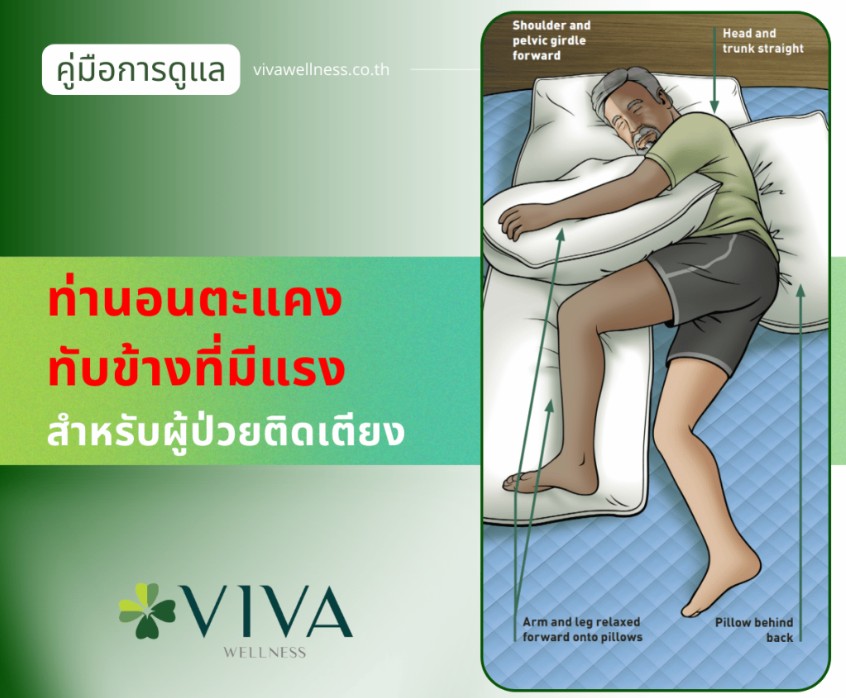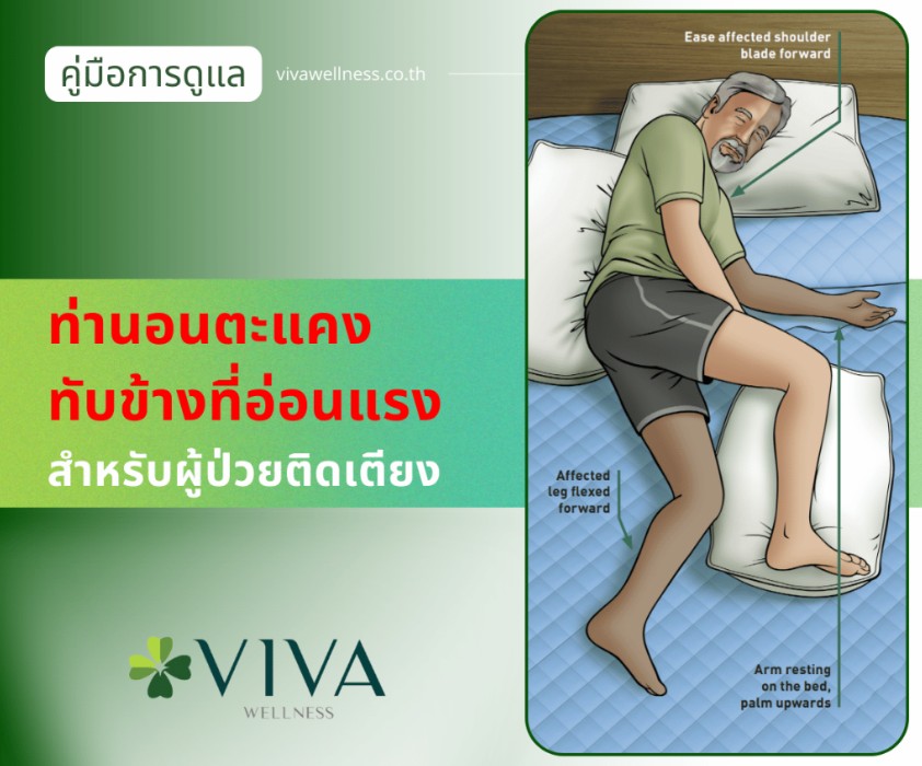 - ในท่านี้ แขนข้างที่อ่อนแรงจะอยู่ด้านบน ผู้ดูแลจึงควรนำแขนข้างที่อ่อนแรงมาทางด้านหน้า นำหมอนมารองแขนไว้เพื่อไม่ให้แขนห้อยตก