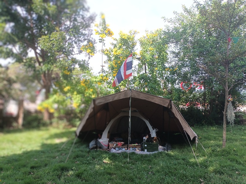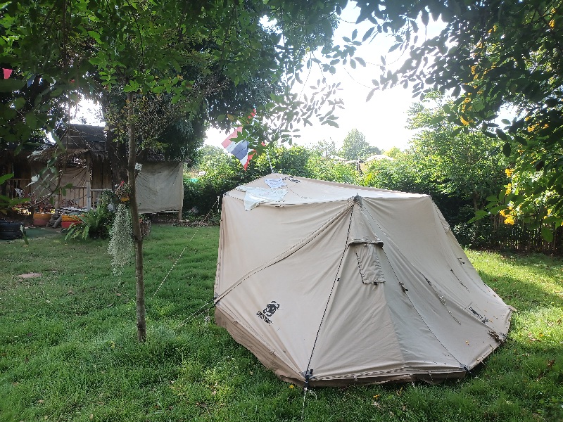 ลมค่อนข้างแรง (และแรงเป็นระยะๆ ตลอด) แดดมา แต่ต้องนี้ค่อนข้างร่ม หญ้าสูง กาง Bushcraft ก่อน แล้วกางเต็นท์ ออ ฟ้าครึ้มๆ ปูพลาสติกรองผ้าใบไว้ก่อนละกัน ใช้เวลาชม.ครึ่งได้กเรียบร้อย