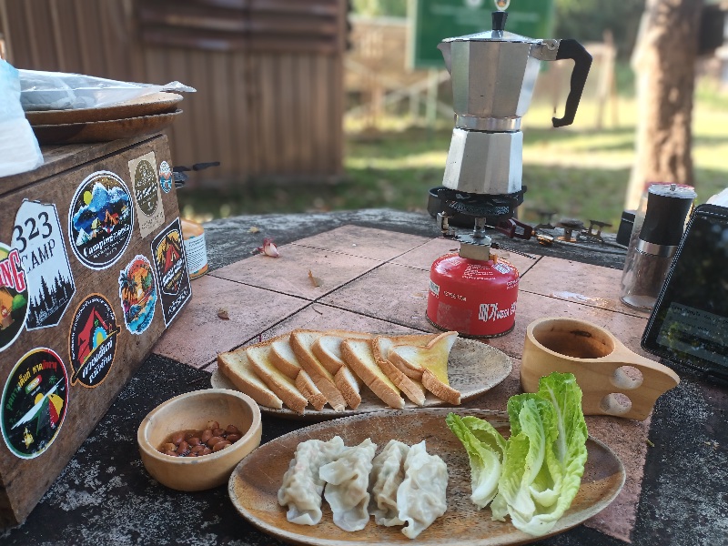 กลับมาขอรองท้องก่อนนอนครับ ง่ายๆ แปปเดียวเสร็จ อิ่มครับ แล้วเตรียมของสำหรับมื้อเช้า คืนนี้มีเพื่อนบ้านนอนกระท่อมและกางเต็นท์ด้วย ไม่เหงาครับ อากาศสบายๆ กำลังดี ออ ลมที่พัดแรงเป็นระยะตลอดวัน ถึงตอนนี้ไม่มีแล้ว