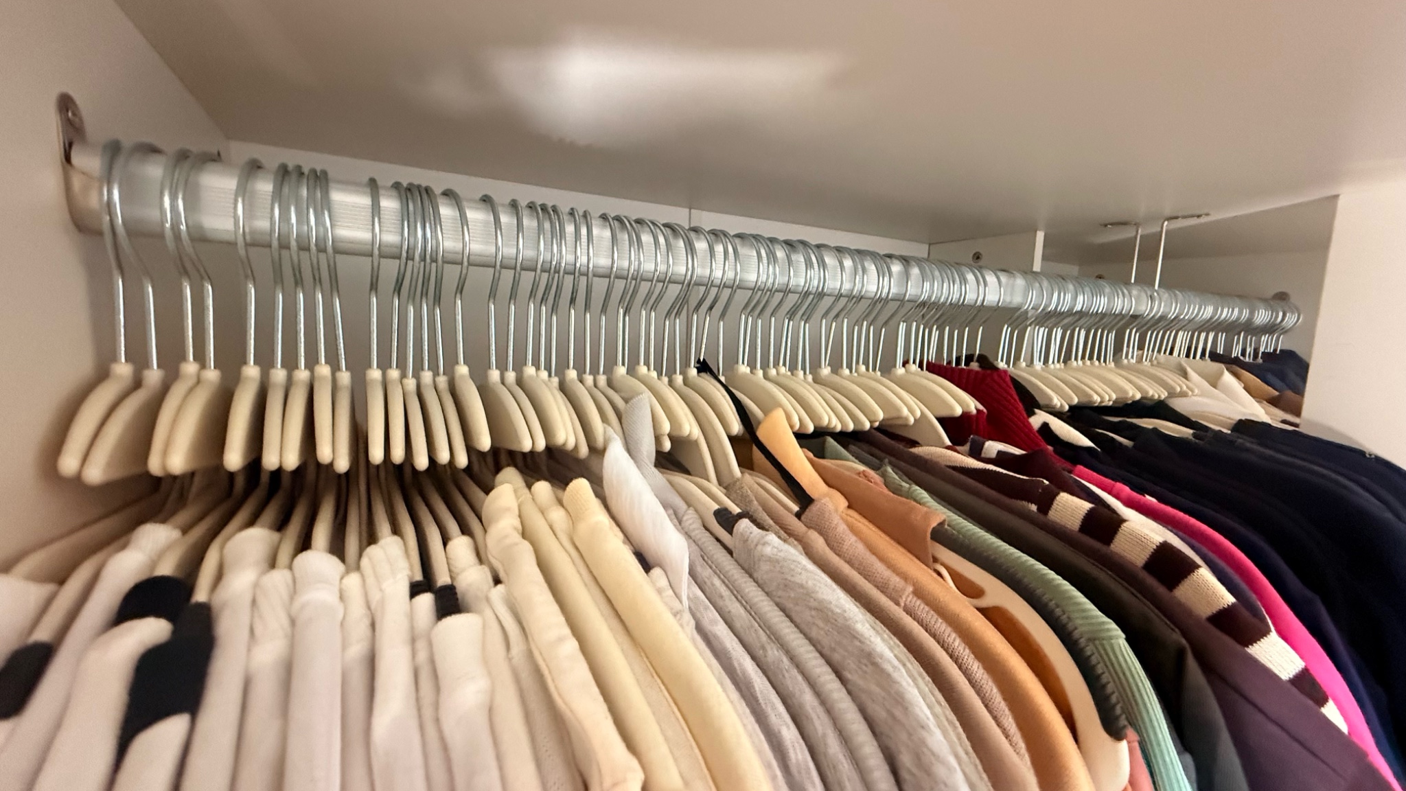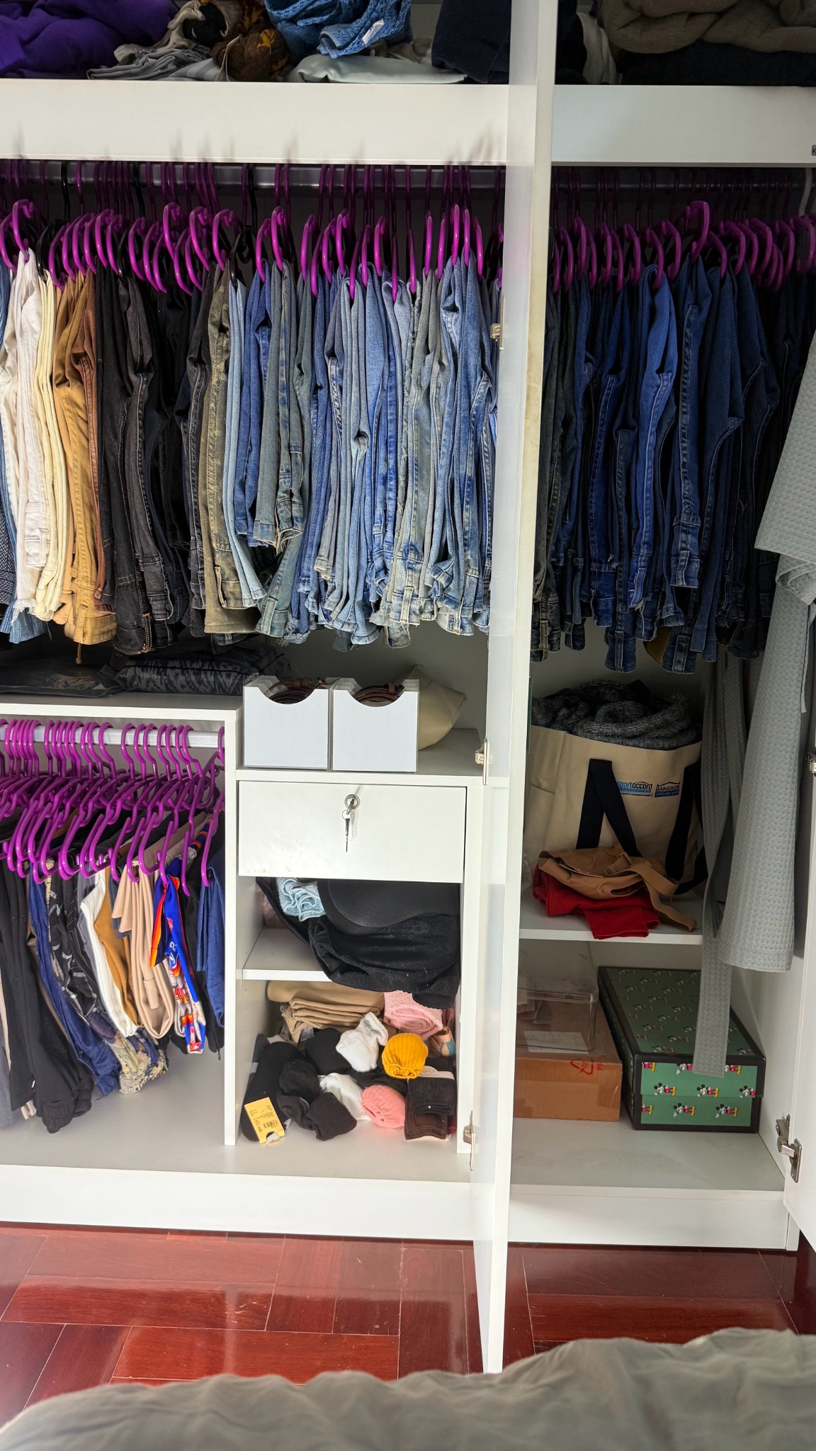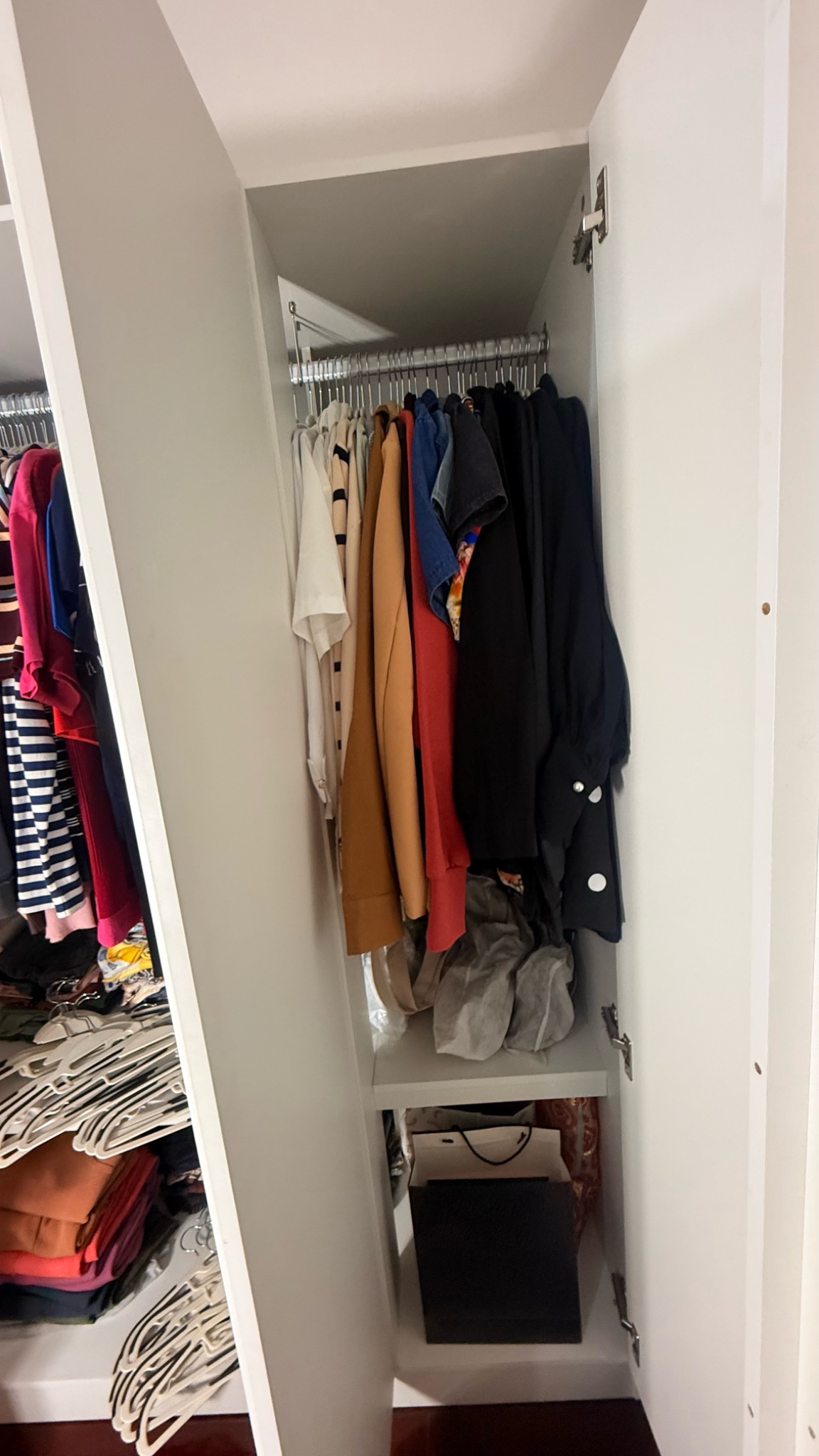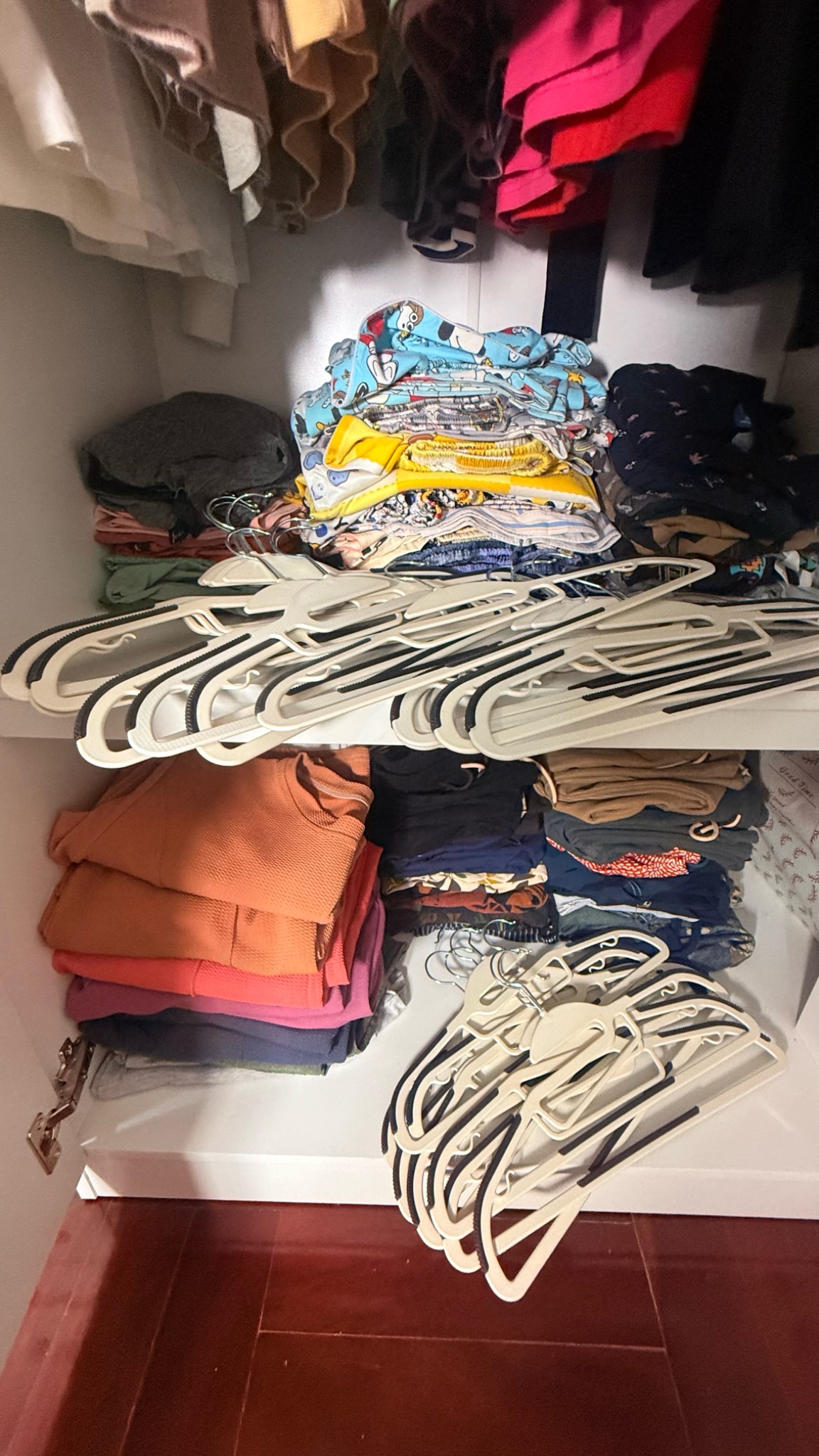 🪄จบตู้เสื้อแล้ว ตอนนี้หาไม้แขวนตู้กางเกงอยู่ แต่จะแบบเดียวกับเสื้อไม่ได้ เพราะกางเกงมีน้ำหนักเยอะกว่าเสื้อ ฉะนั้นไม้แขวนต้องแข็งแรง และไม่กินเนื้อที่บนราวเช่นกัน ตู้กางเกงเลยจะดูแบบแออัดยัดเยียดไปสักนิด