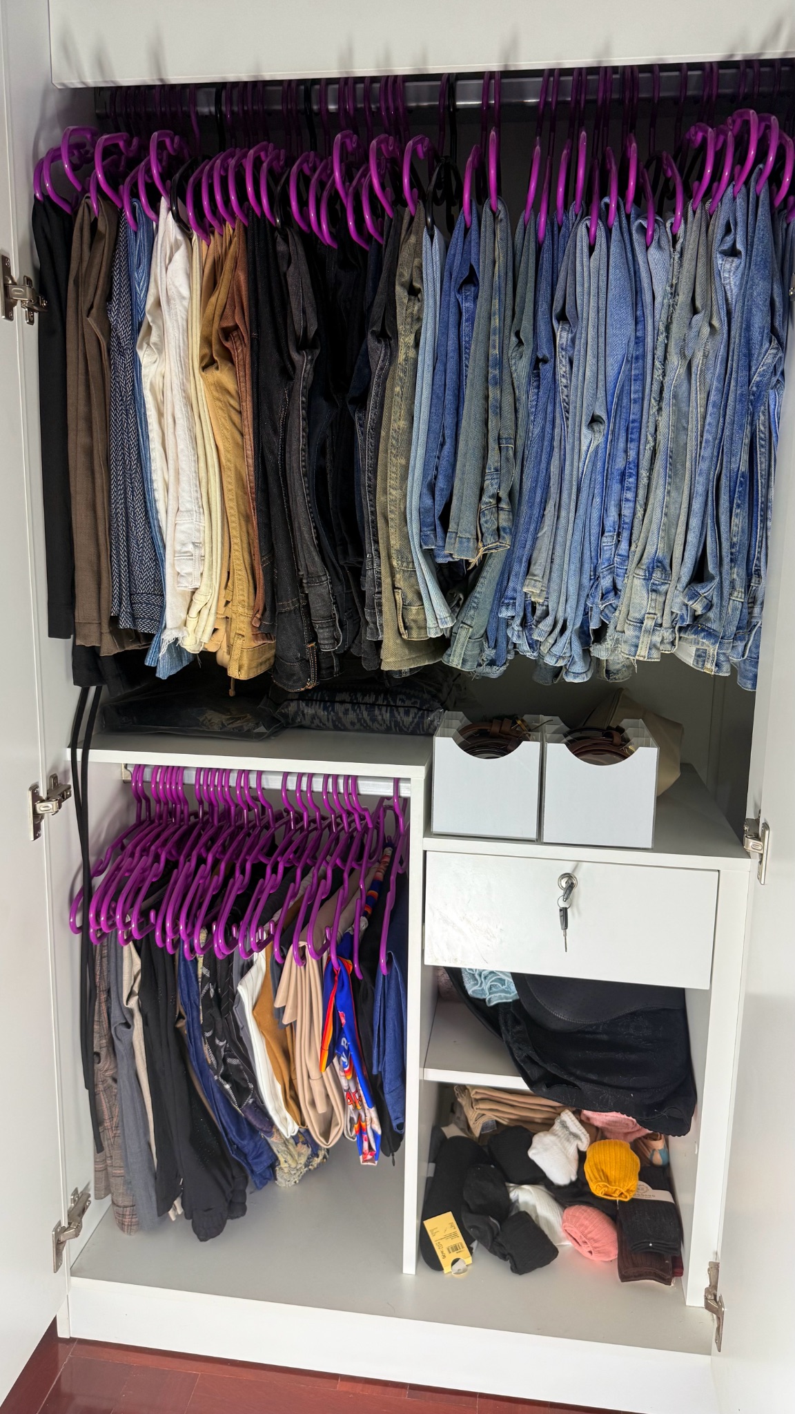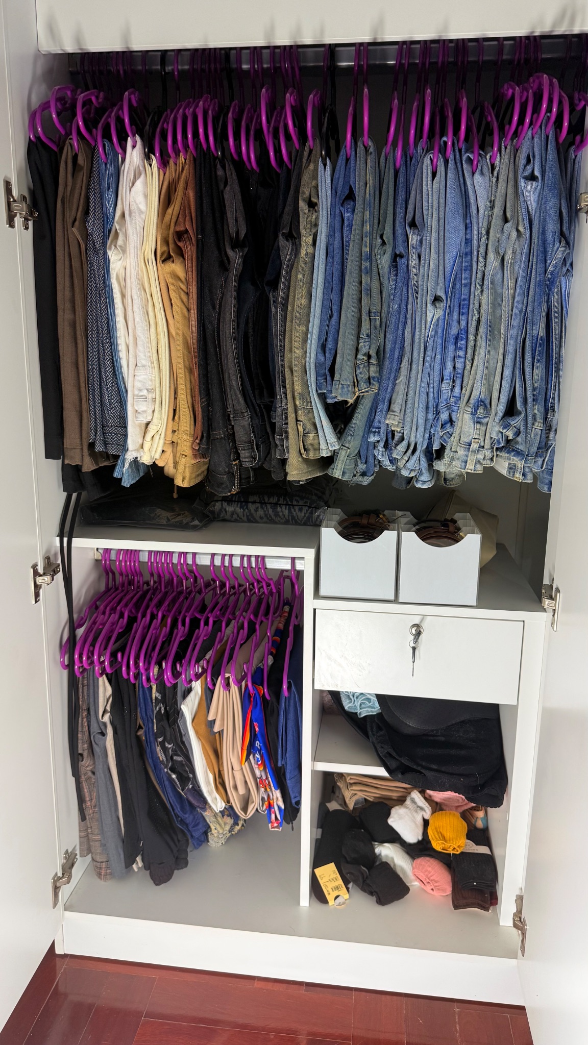 🪄จากเดิมใช้ไม้แขวนค่อนข้างหนา (ไม้แขวนสีม่วง ที่ใช้แขวนกางเกงตู้ข้างๆ) แล้วทำให้กินเนื้อที่บนราว เสื้อผ้าอัดกันมาก ซักรีดเรียบขนาดไหนก็ยับ นี่คือช่วยลดการแออัดไปได้บ้างไม่มากก็น้อย แต่ดีกว่าเดิม