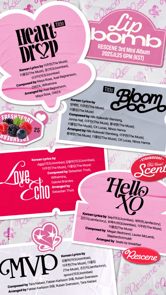 RESCENE 3rd Mini Album <lip bomb> November 25, 2025 (TUE) 18:00 KST Mood BoardPre-release single ‘Heart Drop’💓 November 6, 2025 (THU) 18:00 KST 💓
