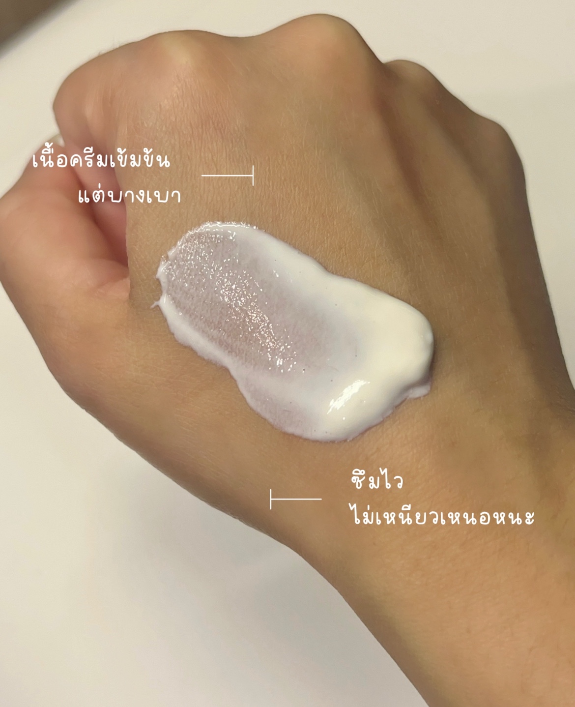 เนื้อสัมผัส : เนื้อครีมสีขาว เกลี่ยง่าย ซึมลงผิวได้ดี ไม่เหนียวเหนอะหนะ
