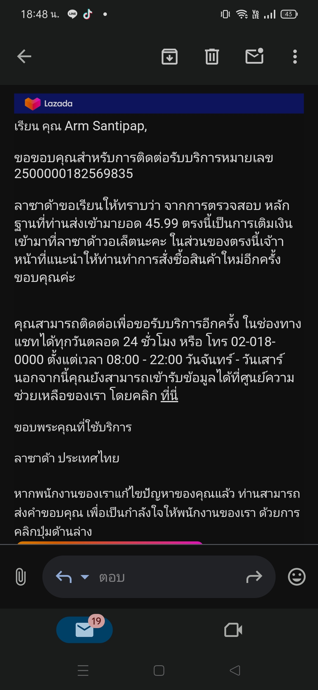 สวัสดีครับ ผมสั่งของกับ Lazada โดยซื้อรองเท้าแตะ กดโค้ดใช้แล้วเหลือชำระเงิน 45.99 บาท เลยใช้การหักจากบัญชีธนาคาร มีการหักเงินในธนาคารเรียบร้อย แต่ขึ้นในแอปธนาคารเพียงว่าหักเงิน/เติมเงินในลาซาด้า45.99บาท(ไม่มีรายละเอียดอื่น) สั่งซื้อไปเมื่อวันที่ 3 พ.ย 68 ในวันนั้นผมสั่งซื้อเครื่องดูดฝุ่นอีกเครื่อง(คนละร้านค้า)ไปด้วย ได้รับเครื่องดูดฝุ่นไปตั้งแต่วันที่7พ.ย แต่รองเท้าที่ซื้อวันเดียวกันนั้น เห็นหลายวันแล้วยังไม่ได้ของ เลยกดเข้าไปดู พบว่าไม่มีข้อมูลสินค้าทั้งในรายการสั่งซื้อ,รายการเตรียมจัดส่ง,รายการที่ต้องรับ ติดต่อทาง lazada ไป สุดท้าย ทางlazada ตอบกลับอีเมล์ มาว่า เป็นการเติมเงินเข้าวอลเล็ต ตามรูปที่แนบ