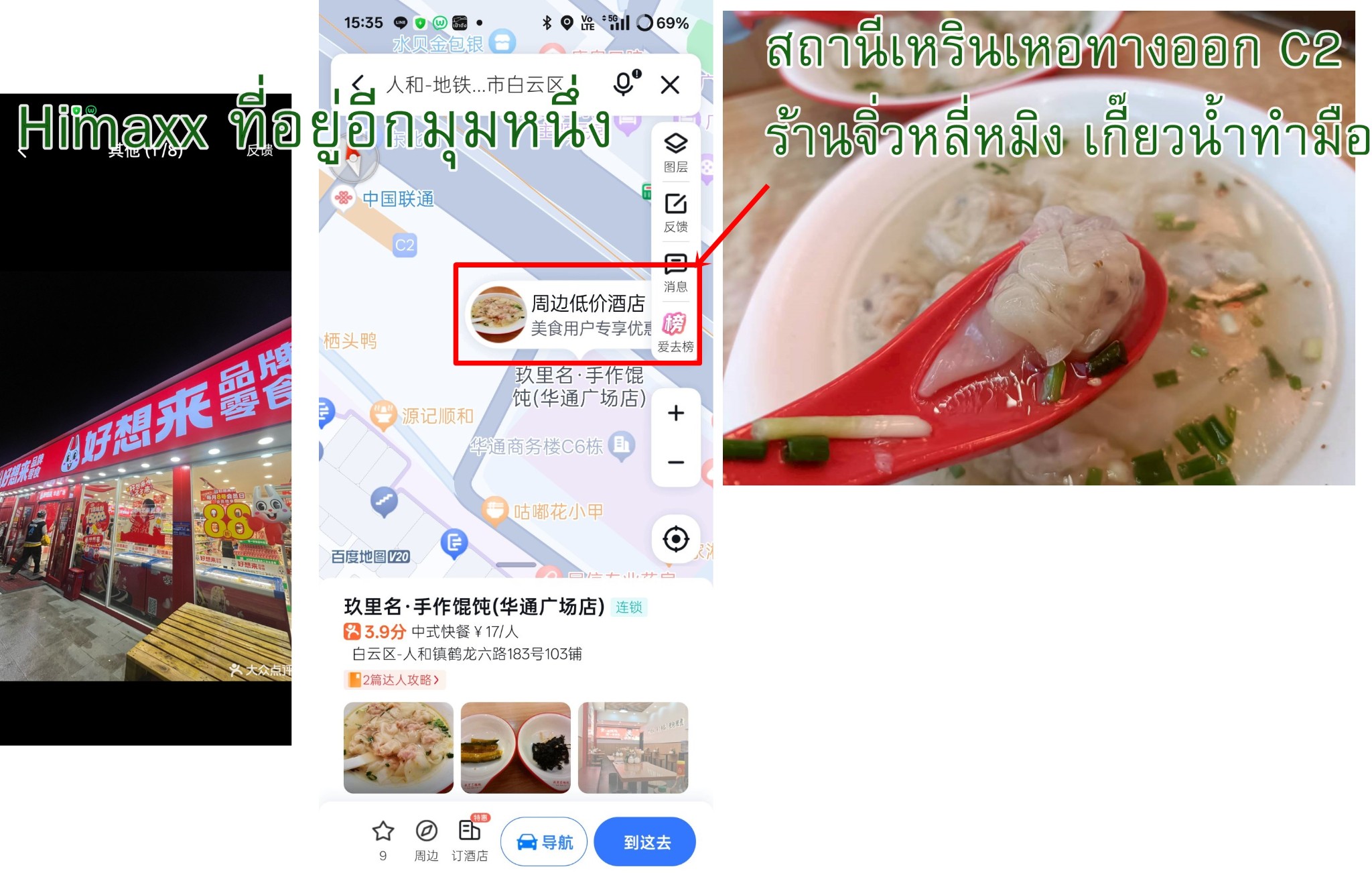 สถานีเหรินเหอของรถไฟฟ้าใต้ดินสาย 3 ที่มาจากสนามบิน ถ้าออกทางออก c2 มองตรงข้าม จะเห็นร้านเกี๊ยวน้ำอยู่หัวมุมถนนที่เราได้แวะทานและรู้สึกว่าน่าจะถูกปากคนไทยครับชื่อร้านจิ่วหลี่หมิง เกี๊ยวน้ำทำมือ (玖里名·手作馄饨)เลือกโต๊ะนั่งแล้วสแกนสั่งได้เลย และแถวๆนั้นจะมีสาขาของ supermarket ขนาดไม่ใหญ่นักที่ขายของกินและเครื่องดื่มราคาไม่แพง ในเมืองจีนมีหลายสาขากระจายอยู่ตามเมืองต่างๆ ภาษาอังกฤษชื่อ Himaxx ภาษาจีนเรียกห่าวเสี่ยงไหล (好想来)