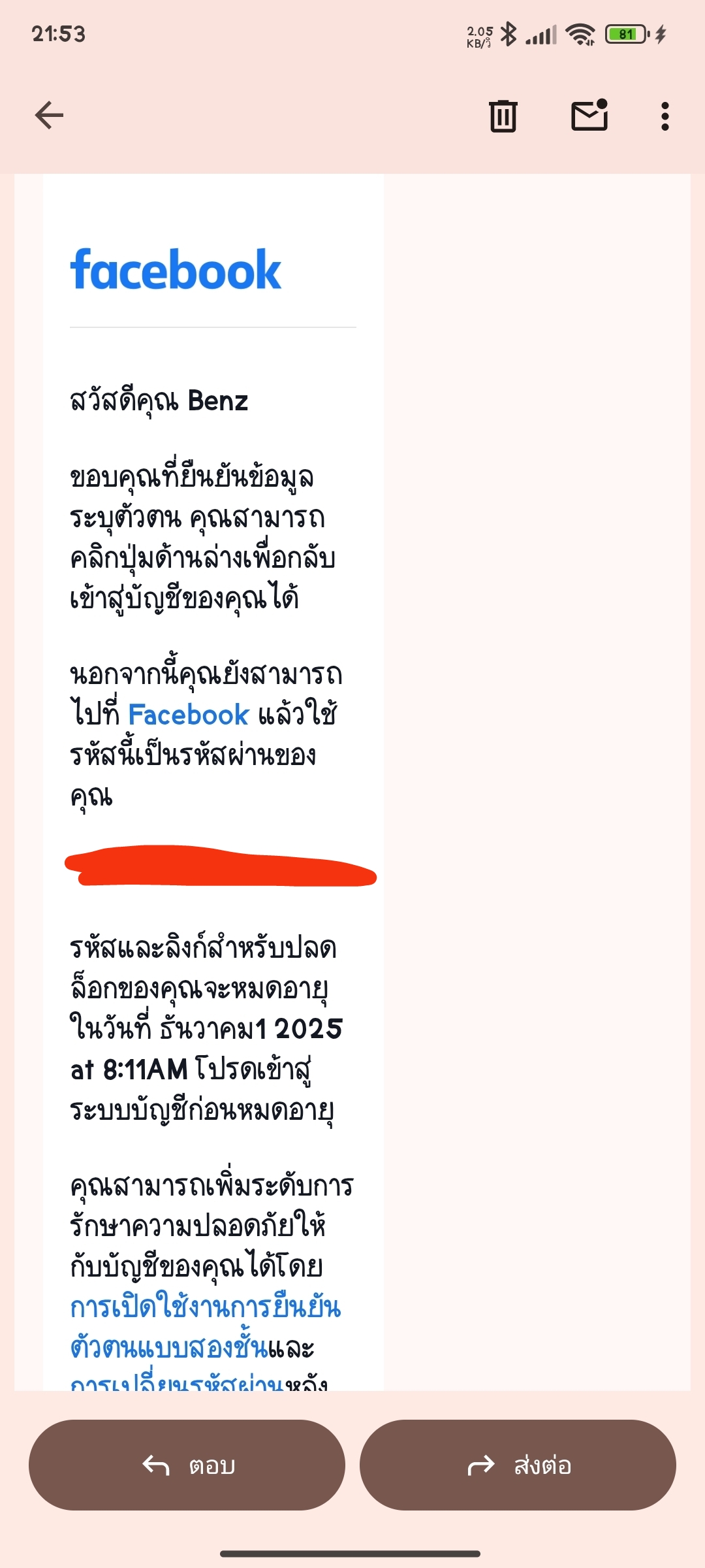 Facebook โดนระงับ แล้วส่งอีเมลแบบนี้มาควรทำยังไงดีคะ ลองเอาอีเมลที่ใช้แล้วล็อคอินด้วยรหัสที่เฟสบุ๊คแจ้งมาก็เข้าไม่ได้ค่ะ