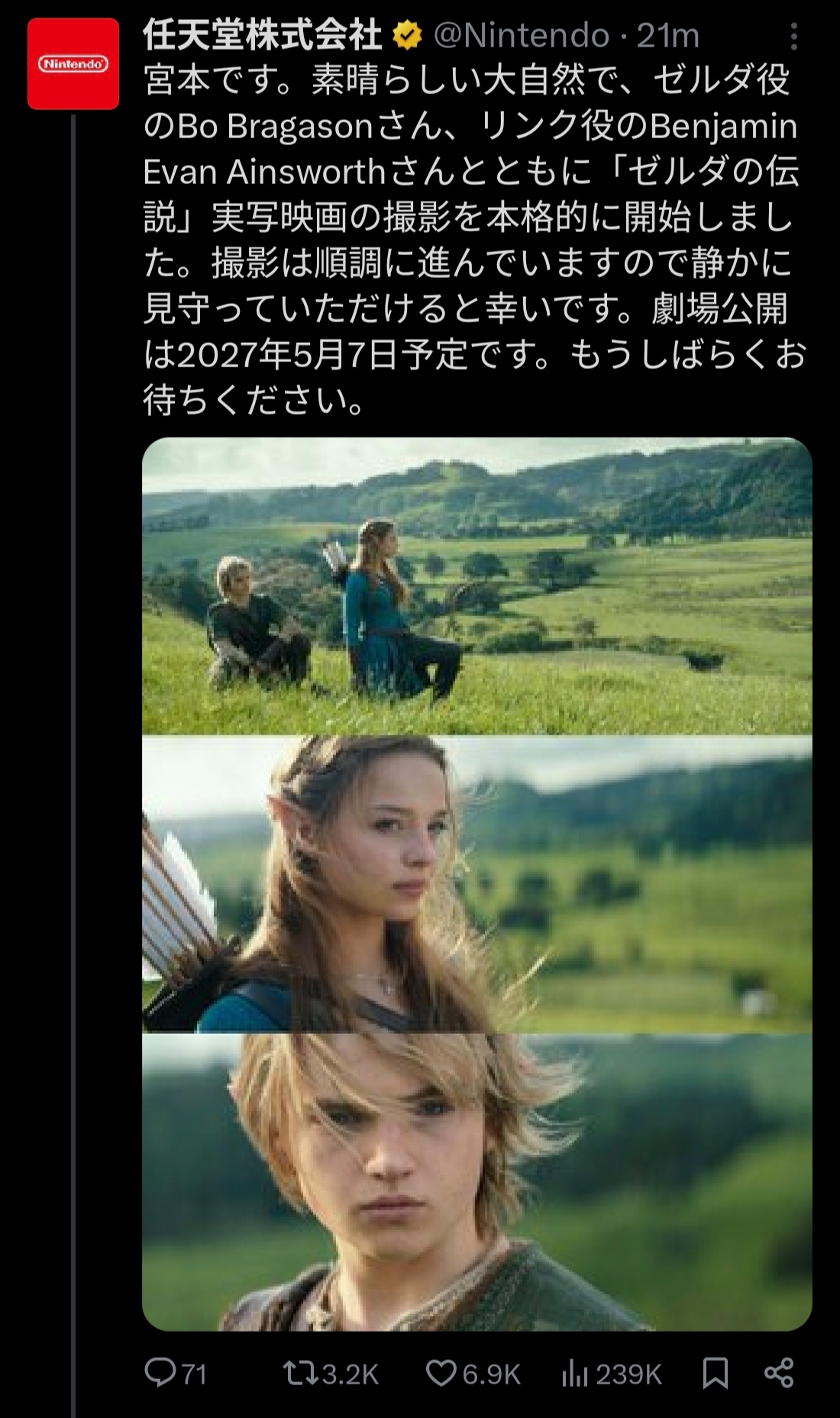 สรุปสั้นๆคือชิเงรุ มิยาโมโตะ ประกาศว่าได้เริ่มถ่ายทำหนัง the legend of zelda แล้ว โดนคนที่เล่นเป็น Link คือ Benjamin Evan Ainsworth และคนที่เล่นเป็น Zelda คือ Bo Bragason กำหนดฉาย 7 พ.ค. 70 ครับ