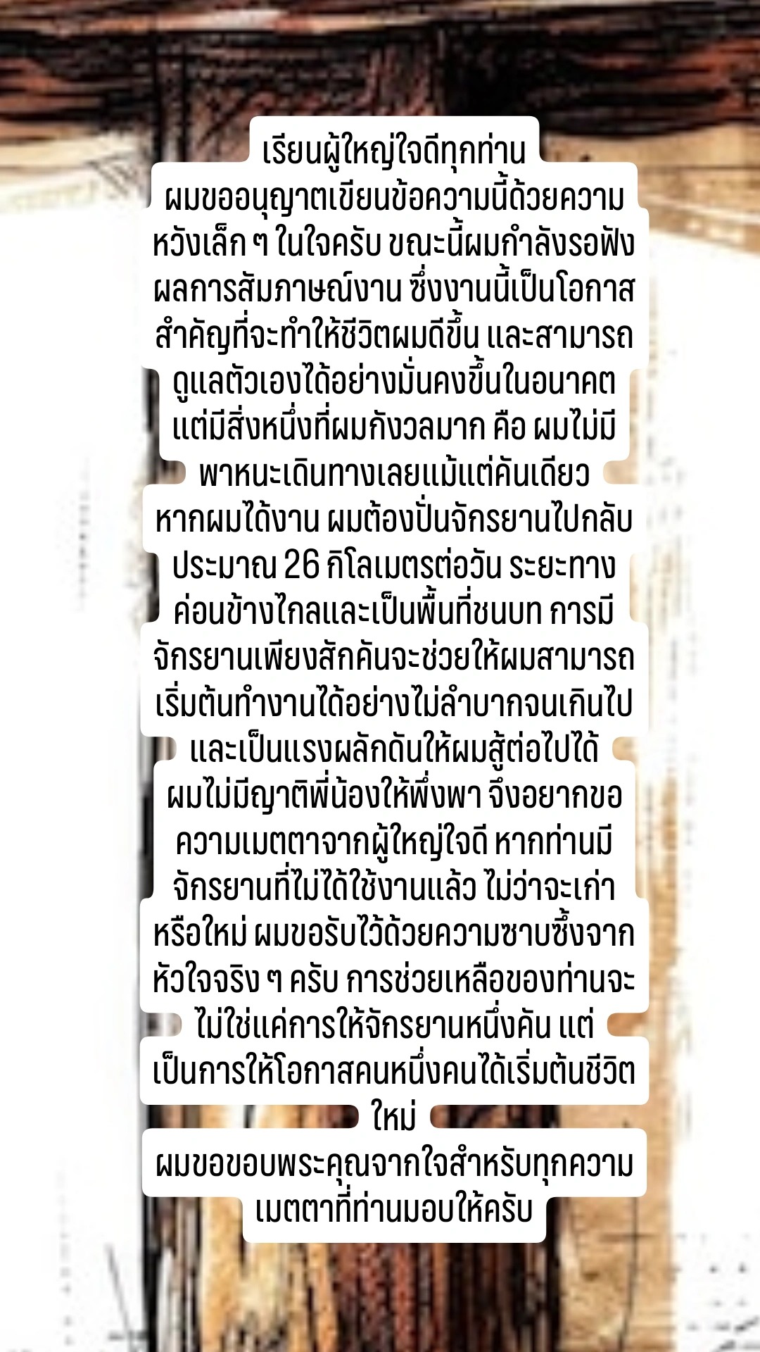 เรียนผู้ใหญ่ใจดีทุกท่าน ผมขออนุญาตเขียนข้อความนี้ด้วยความ หวังเล็ก ๆ ในใจครับ ขณะนี้ผมกำลังรอฟัง ผลการสัมภาษณ์งาน งานนี้เป็นโอกาส สำคัญที่จะทำให้ชีวิตผมดีขึ้น และสามารถ ดูแลตัวเองได้อย่างมั่นคงขึ้นใน