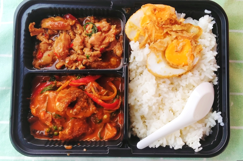 อรุณสวัสดิ์ค่ะวันนี้หนาวขึ้นมาก ฝนตกด้วย ☔แวะตลาดเช้าร้านข้าวราดแกง เลือกพะแนงไก่ กับ ผัดผักเต้าหู้ กล่องละ 35 บาท ตบท้ายด้วยขนม TORO 20 บาท อิ่มอร่อยไปอีกมื้อ ~