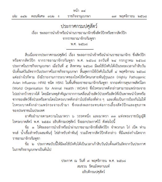 ราชกิจจานุเบกษา เผยแพร่ประกาศกรมปศุสัตว์ ชะลอนำเข้าสัตว์ปีก-ซากสัตว์ปีกจากกัมพูชา 90 วัน นับแต่ 18 พ.ย. 68 ป้องกันไข้หวัดนกสายพันธุ์รุนแรง HSNI แพร่กระจายเข้าไทย หลังยังมีรายงานการระบาด