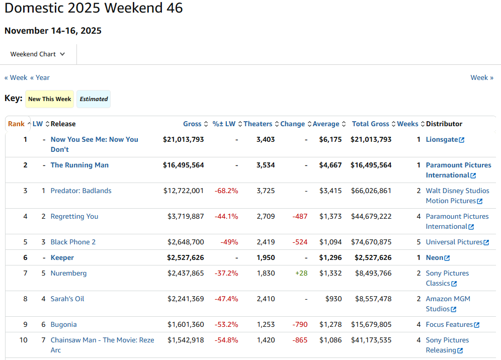 สุดสัปดาห์ที่ผ่านมาคือการประลองกันระหว่างสุดสัปดาห์ที่ 2 ของ Predator: Badlands ที่คนดูพูดกันปากต่อปากถึงความมันส์แบบไม่พัก กับหนัง 2 เรื่องที่เปิดตัวใหม่คือ The Running Man และ Now You See Me 3 โดยทั้งสามเรื่องเป็นหนังที่มีกลุ่มลูกค้าเป้าหมายใกล้เคียงกัน ผลปรากฎว่าผู้ชนะของสงครามครั้งนี้คือ Now You See Me: Now You Don’t ที่ใครๆต่างก็มองว่าเป็นมวยรองไปซะอย่างงั้น