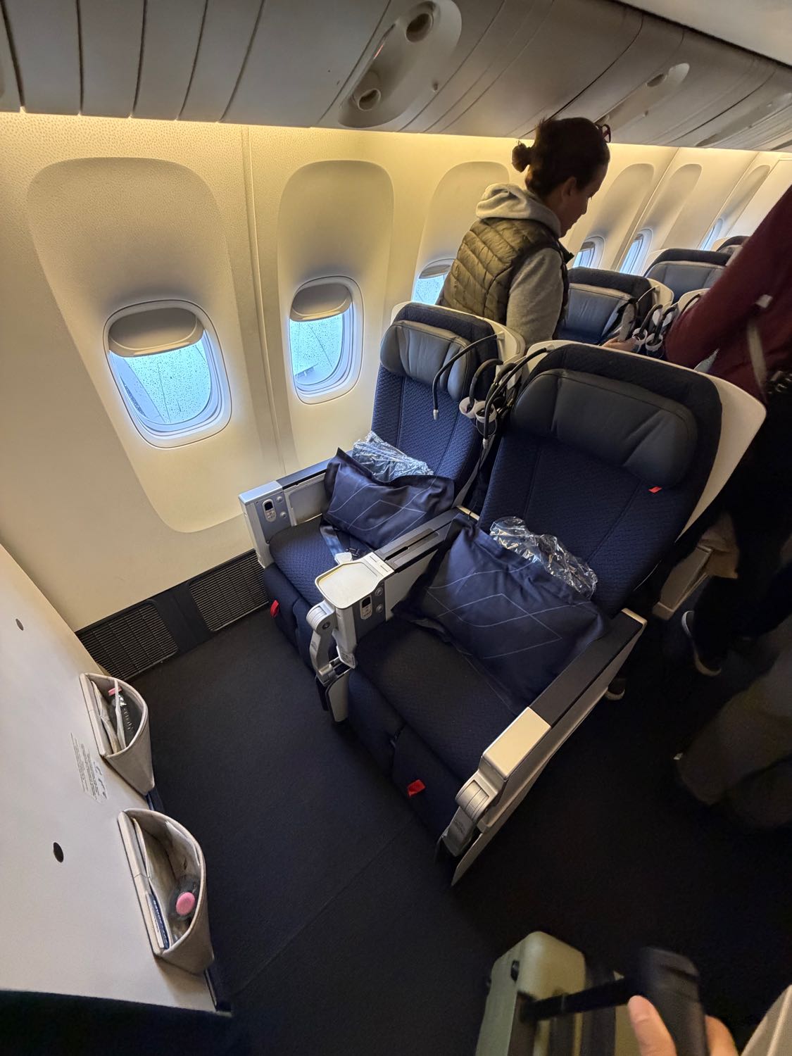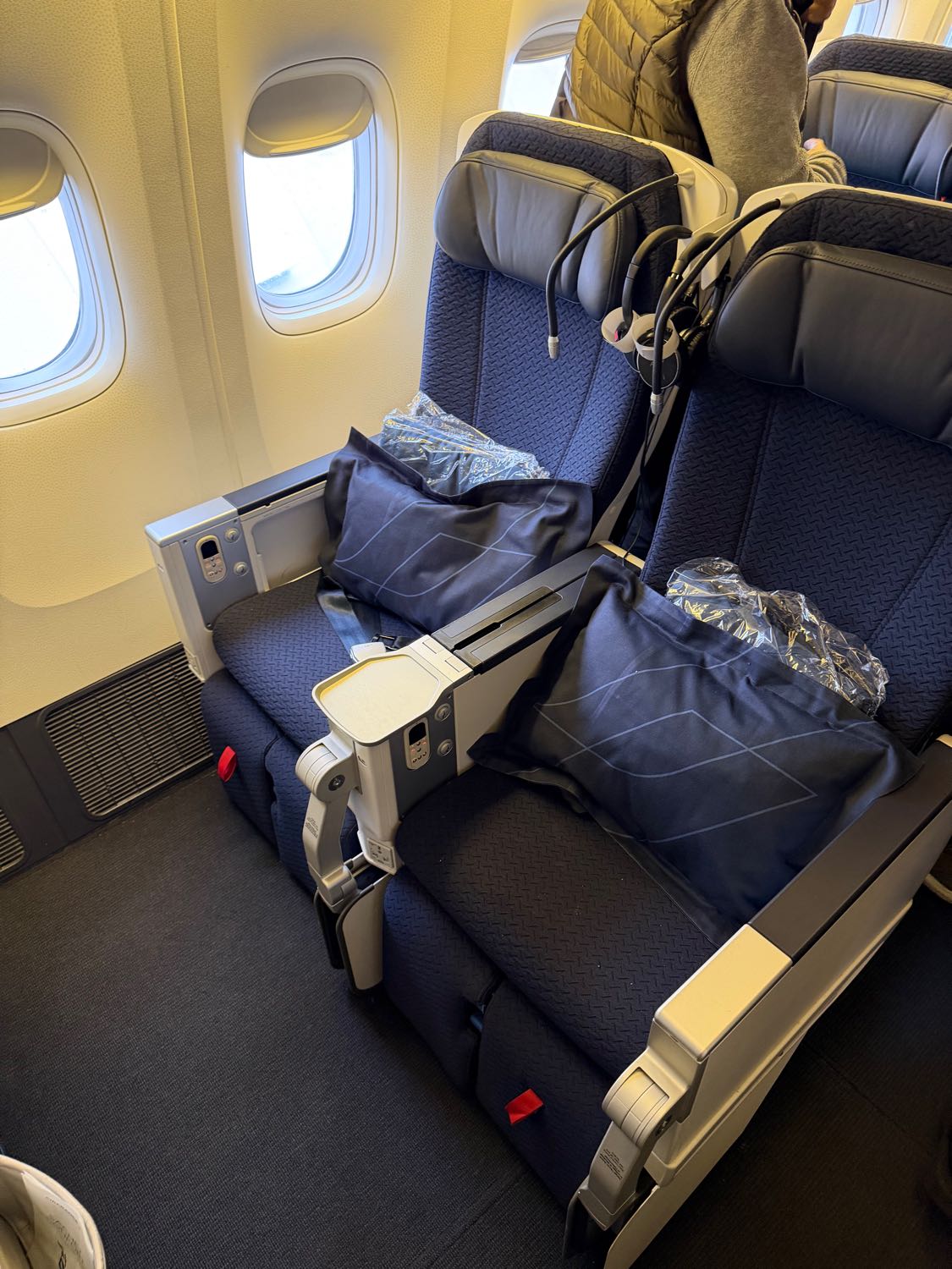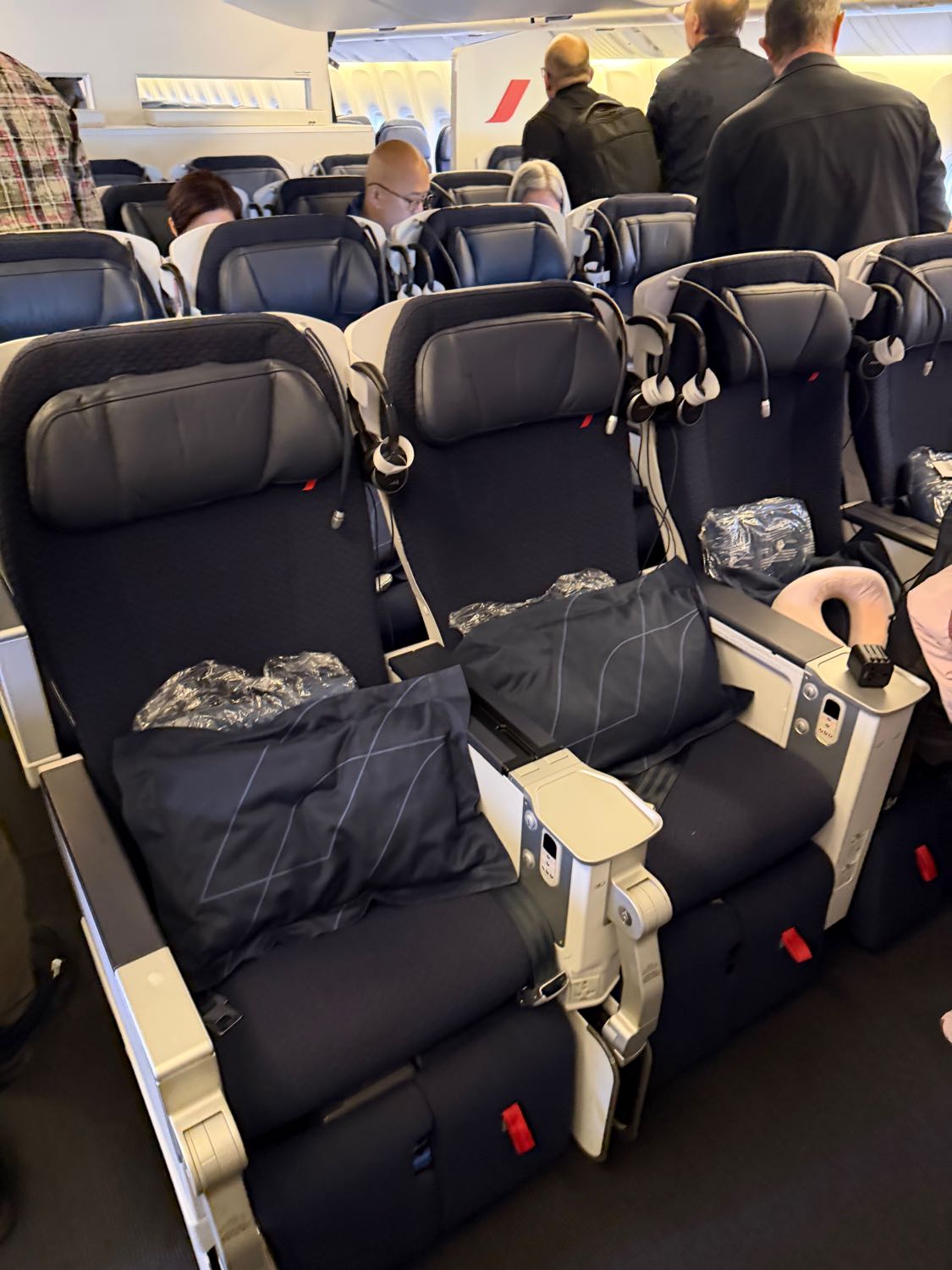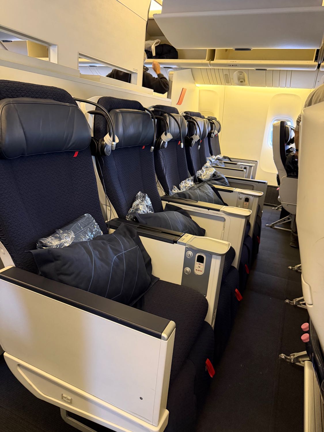 เมื่อขึ้นเครื่องแล้ว ผมจองที่นั่งแบบ Premium Economy นะครับ แพงขึ้นมาจากปกติหน่อย ลงทุนเพราะว่าเดินทางไฟล์นี้ 12 ชั่วโมงกว่าๆ มันนาน เลยขอซื้อความสบายหน่อยนึง หน้าตาของเบาะก็จะเป็น 2-3-2 ครับ นั่งกว้างกว่าปกตินะครับ เสริฟอาหารดีขึ้น และมีเครื่องดื่มบริการเรื่อยๆ