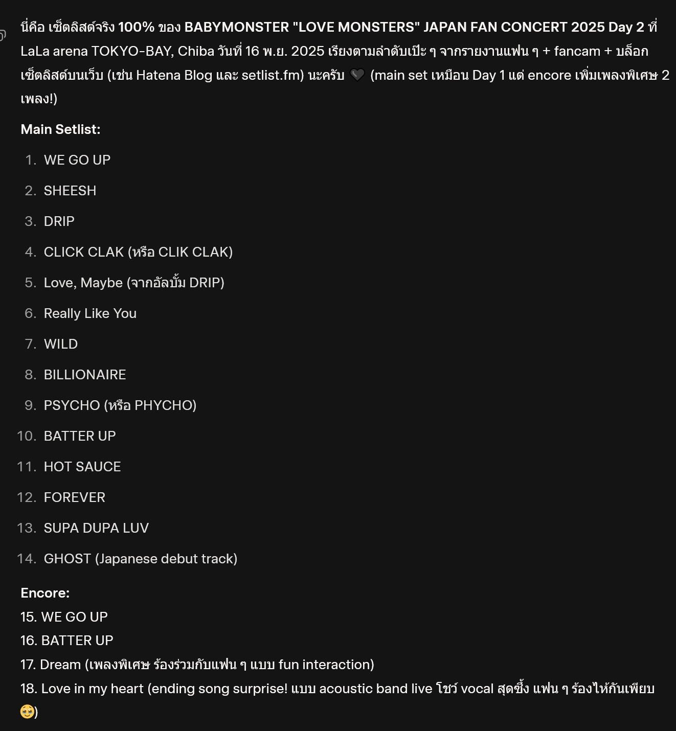 สำหรับคืนแรกวันที่ 15-11-2025 ก็ผ่านพ้นไปด้วยดี แล้วตอนนี้ก็เริ่มคอนของวันที่ 2 แล้ว บรรยากาศสนุกมาก ชาวญี่ปุ่นได้ฟังเพลงใหม่ๆ ทั้ง 4 เพลง พ่วงกับเพลง Ghost ที่ร้องเป็นภาษาญี่ปุ่นด้วย ก็มีเพลงใหม่เบ็ดเสร็จ 5 เพลง