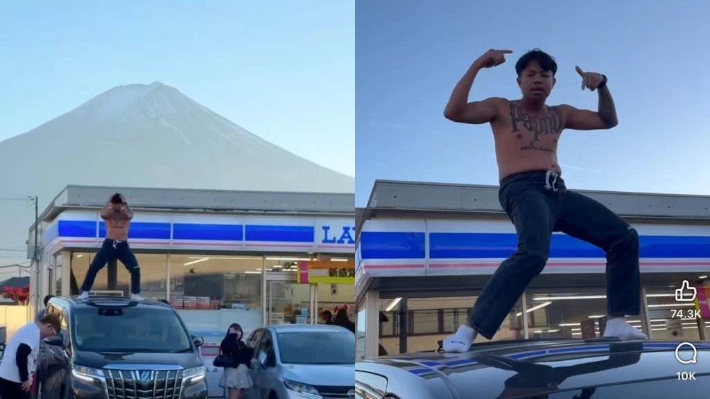 ปรากฏว่าได้ ถอดเสื้อ กระโดดขึ้นไปเต้นบนหลังคารถเช่า หน้า Lawson Kawaguchiko Station Branch