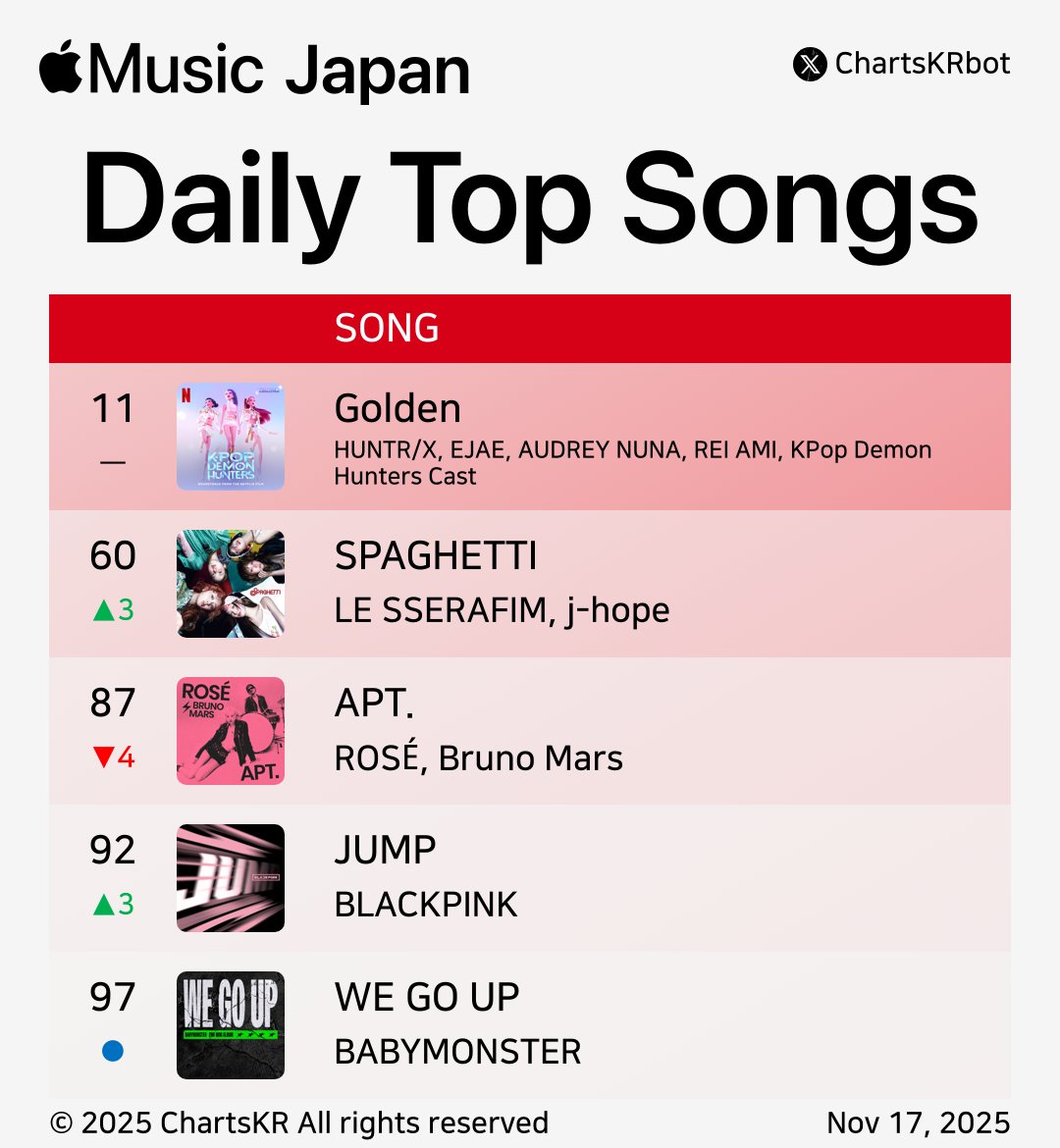 เพลง WE GO UP ของ BABYMONSTER อยู่บน Apple Music Japan Top 100 Daily Chart ในอันดับที่ 96 เป็นเพลงเดียวของเคป๊อปเจน 5