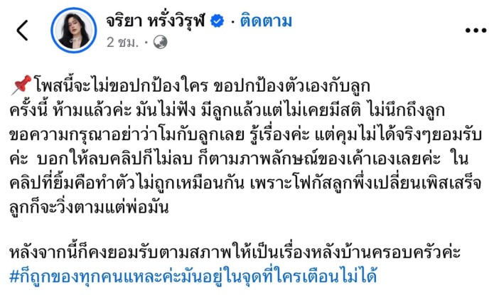 -แตงโม ภรรยาของแจ็ก แปปโฮ ได้ออกมาโพสต์ยอมรับว่า พยายามห้ามแล้วแต่ไม่เป็นผล มีลูกแล้วแต่ไม่เคยมีสติ ไม่นึกถึงลูก ขอความกรุณาอย่าว่าตนเองกับลูก คุมไม่ได้จริงๆ บอกให้ลบคลิปก็ไม่ลบ และไม่ขอปกป้องการกระทำดังกล่าว
