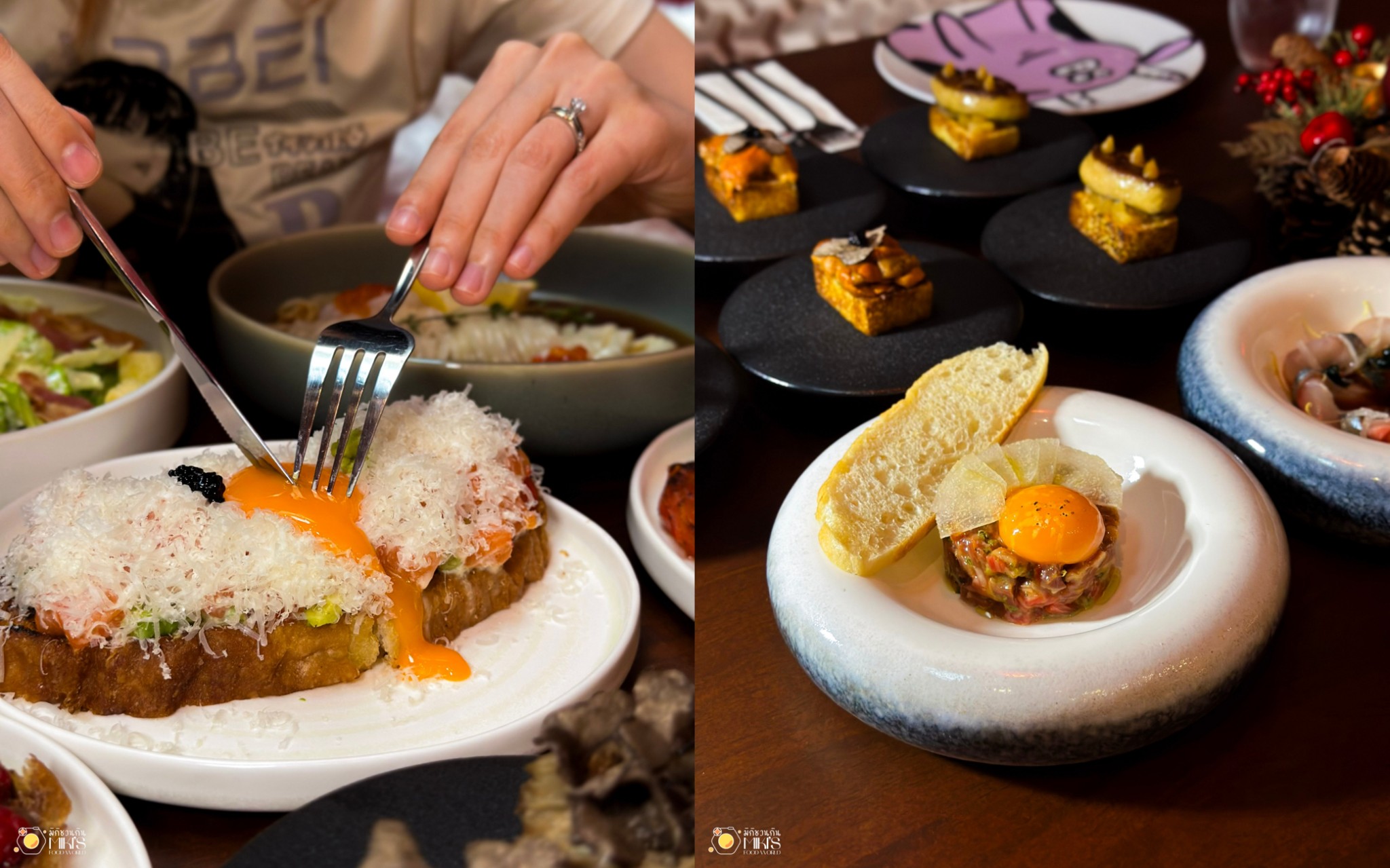 Beef Tartare (390) ทาร์ทาร์เนื้อนุ่มฉ่ำ หั่นละเอียดแบบพอดี มีความมันและรสอูมามิหอมๆ ท็อปด้วยไข่แดงดิบที่เพิ่มความนัว ยิ่งทานกับขนมปังกรอบคือดีมาก