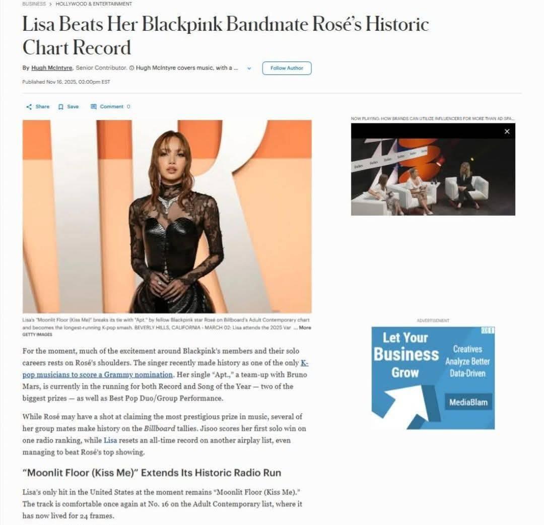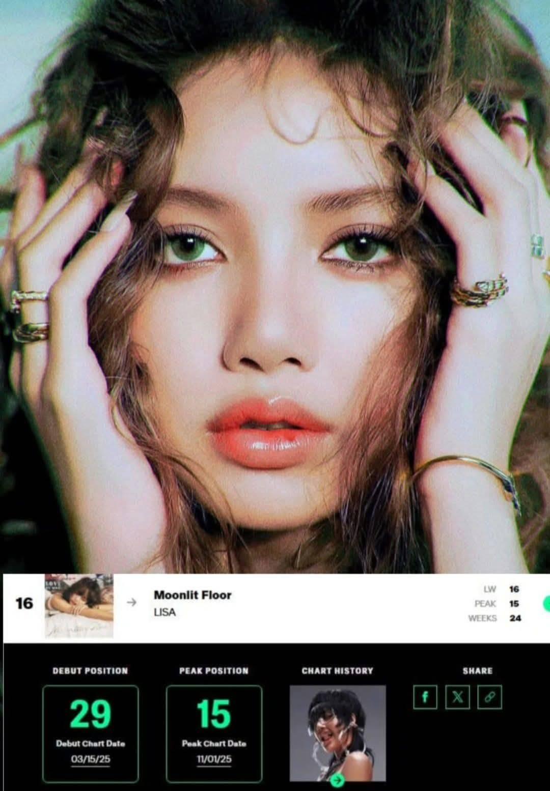 ล่าสุดเพิ่งสร้างประวัติศาสตร์ใหม่อีกครั้ง นิตยสาร Forbes รายงานตรงๆเลยว่า ลิซ่า ทำลายสถิติที่..เป็นสถิติบนชาร์ต Adult Contemporary ซึ่งเป็นชาร์ตที่คนในอเมริกา ชอบเปิดเพลงฟังยาวๆ ฟังเพลินๆ แล้วคนทั่วไปก็ชอบมาก ดังนั้นใครจะอยู่ได้นานต้องได้รับความนิยมจริง และเพลงที่ทำให้เกิดปรากฏการณ์นี้ก็คือ Moonilt Floor เพลงหวานละมุนที่น้องน้องลิซ่าโชว์โทนนุ่มๆ จนคนอเมริกันติดกันไปทั่ว ซึ่งตอนนี้ ยังคงยืนสวยๆอยู่ที่อันดับ 16 แบบนิ่งๆ ไม่ต้องพึ่งดราม่าใดๆเลย แต่ความพีคคือเพลงนี้อยู่ในชาร์ตมาแล้ว 24 สัปดาห์เต็ม นานมากสำหรับเพลงที่จะอยู่บนชาร์ตนี้