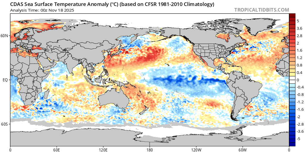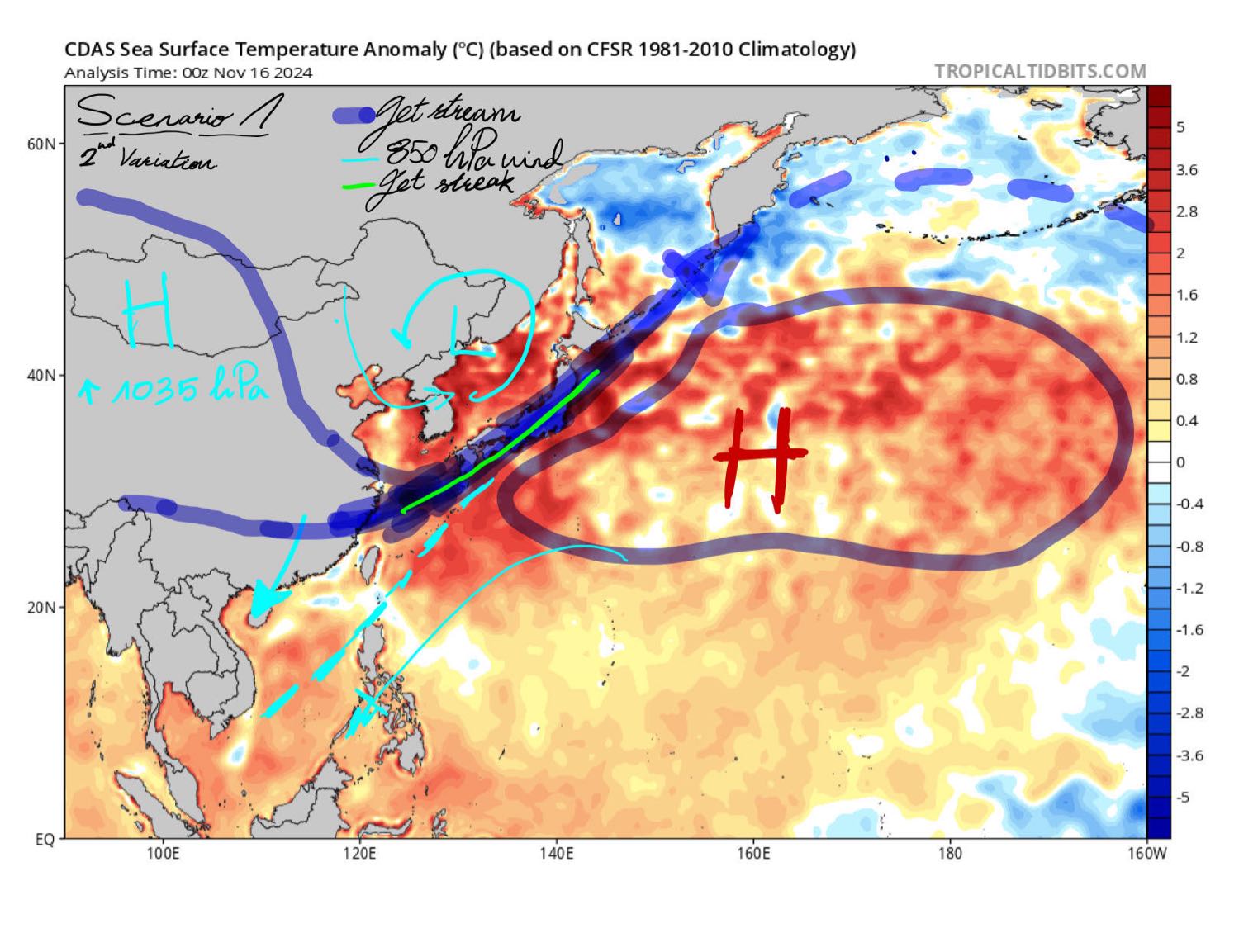 เช่นเดิม เริ่มต้นด้วยการดูสภาพท้องทะเลในปีนี้กันก่อน ดูๆแล้วในภาพกว้างของมหาสมุทรแปซิฟิกปีนี้แทบไม่ต่างกับของปีที่แล้วเท่าใดนัก คือตลอดบริเวณกลางแปซิฟิกเย็นโดยทั่วกัน (ลักษณะของลานีญา)บริเวณทะเลโอคอตซ์ ลากผ่านทะเลแบริ่ง ยันอลาสก้ามีลักษณะเย็นโดยทั่วกันเช่นกัน ในขณะที่แถบทะเลญี่ปุ่น และทิศตะวันออกของทะเลญี่ปุ่นก็ร้อนกว่าปกติโดยทั่วกัน ซึ่งของปีนี้จะร้อนน้อยกว่าของปีที่แล้วอยู่พอสมควร และจะค่อยๆเย็นกว่าปกติเมื่อเข้าสู่ฤดูหนาวทางดาราศาสตร์เต็มตัวในเดือนมกราคมต่อไป
