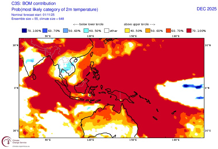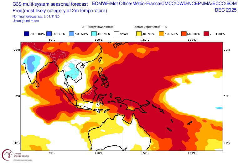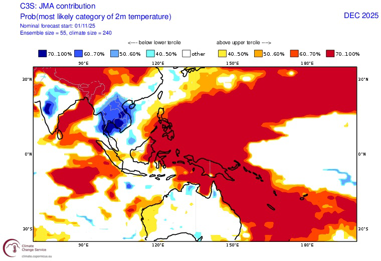 อย่างไรก็ดี QBO- หรือลมชั้นสตราโตสเฟียร์แถวเส้นศูนยสูตรที่ไหลจากตะวันออกไปตะวันตก มักส่งผลให้ลมกรดกึ่งเขตร้อนโฉบลงต่ำกว่าปกติเมื่อเทียบกับแบบ QBO+ อย่างปีแล้ว ประกอบกับมหาสมุทรอินเดียฝั่งตะวันตกที่ค่อนข้างเย็น นี่จึงทำให้มีความเป็นไปได้ว่าลมกรดกึ่งเขตร้อนอาจโฉบต่ำและลากเอาความชื้นจากเมาะตะมะได้มากกว่าปีที่แล้ว และยังทำให้จุดโฟกัสของอากาศหนาวปีนี้มีสิทธิ์เบี่ยงมาทางภาคเหนือมากกว่าปีที่แล้วที่เป็น QBO+ ภาคเหนือน่าจะหนาวง่ายกว่าปีที่แล้วด้วยน่ะครับ รวมไปถึงต่อให้หากลมวนขั้วโลกแตก ลมตะวันตกก็น่าจะเทียวพาอากาศหนาวมาหาภาคเหนือได้ไม่ยากเย็นนักในปีนี้หากไม่มีอะไรมาเปลี่ยนแปลง (ปัจจัยประหลาดอย่างผลของภูเขาไฟ Hunga Tonga เมื่อ 3 ปีที่แล้วน่าจะหมดลงเสียที”สภาวะโลกเดือด“น่าจะได้จากเราไปแล้ว)