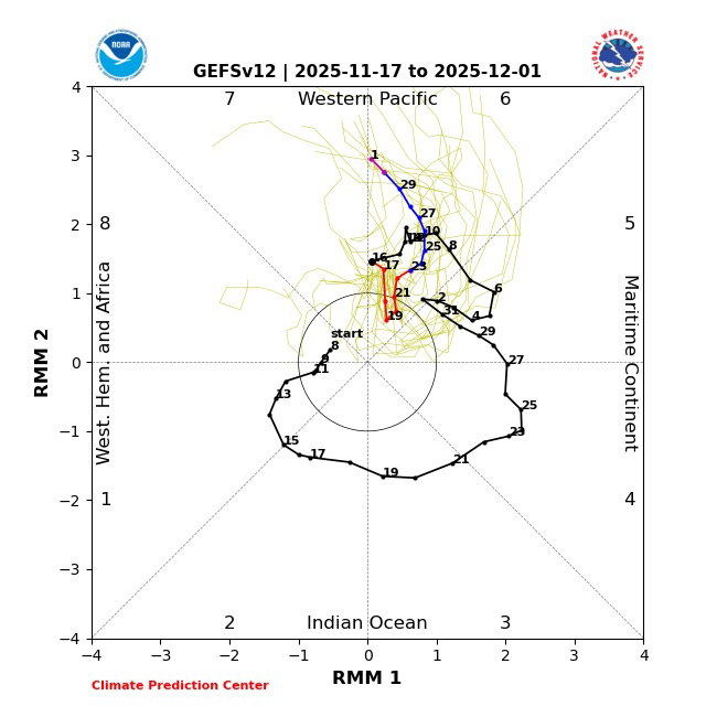 MJO ปีนี้มีสิทธิ์คล้ายปีแล้ว คือ น่าจะคาอยู่ที่เฝสที่ยอดเยี่ยมอย่างเฝส 5-6 ได้นาน และอาจวิ่งเลยเฝสสุดห่วยอย่างเฝส 7 แป๊บๆ และวนกลับมาเฝสที่ดีใหม่ในเดือนถัดไป