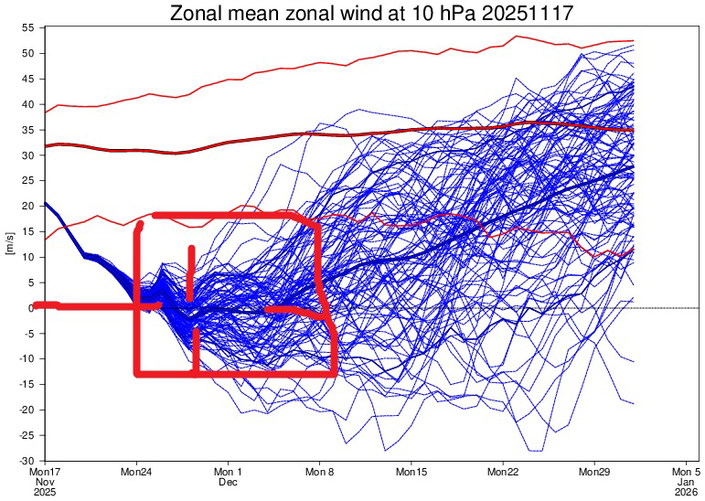 โหงวเฮ้งปีนี้ยอดเยี่ยมขนาดนี้จึงไม่แปลกที่ว่าตอนนี้ลมวนขั้วโลกชั้นสตราโตสเฟียร์มันกำลังอ่อนระทวยมาก และมีสิทธิ์แตกมันตังแต่ต้นเดือนหน้า ซึ่งถ้าตามนั้นจริงก็โบกมือลาหน้าหนาวได้เลยครับ ชาวกทม. มันจะมาได้สุดแค่รอบต้นเดือนหน้าเป็นอย่างมากก็เท่านั้น ให้รีบกอบโกยความรู้สึกเย็นๆนี้ไว้ให้ได้มากที้สุด (ฮาปนโฮ) ความเร็วลมมันแตะ 0 หรือไปยันติดลบเมื่อไหร่ก็แตกแน่ๆล่ะครับลมวนขั้วโลกปีนี้ ไปซะตั้งแต่หัวฤดูเลย ตอนนี้โอกาสแทบจะ 50-50 เข้าไปแล้ว ก็ต้องเอาใจช่วยให้มันกลับมาหมุนแรงได้ตามเดิม ซึ่งดูตามเส้นก็เหมือนว่าถ้าเลยช่วงวันพ่อไปแล้วกลับมาได้ ยกแรกเราอาจจะเข้าวิน รอดแพ้น็อคได้อย่างฉิวเฉียด ต้องไปรอลุ้นยกถัดๆไปต่อ [ซึ่งดูทรงแล้วคงมีอีก 5-6 ยกจนกว่าจะหมดเดือนมกราฯ โหงวเฮ้งลมวนขั้วโลกมันอยากแพ้น็อคเสียเหลือเกินสำหรับปีนี้]