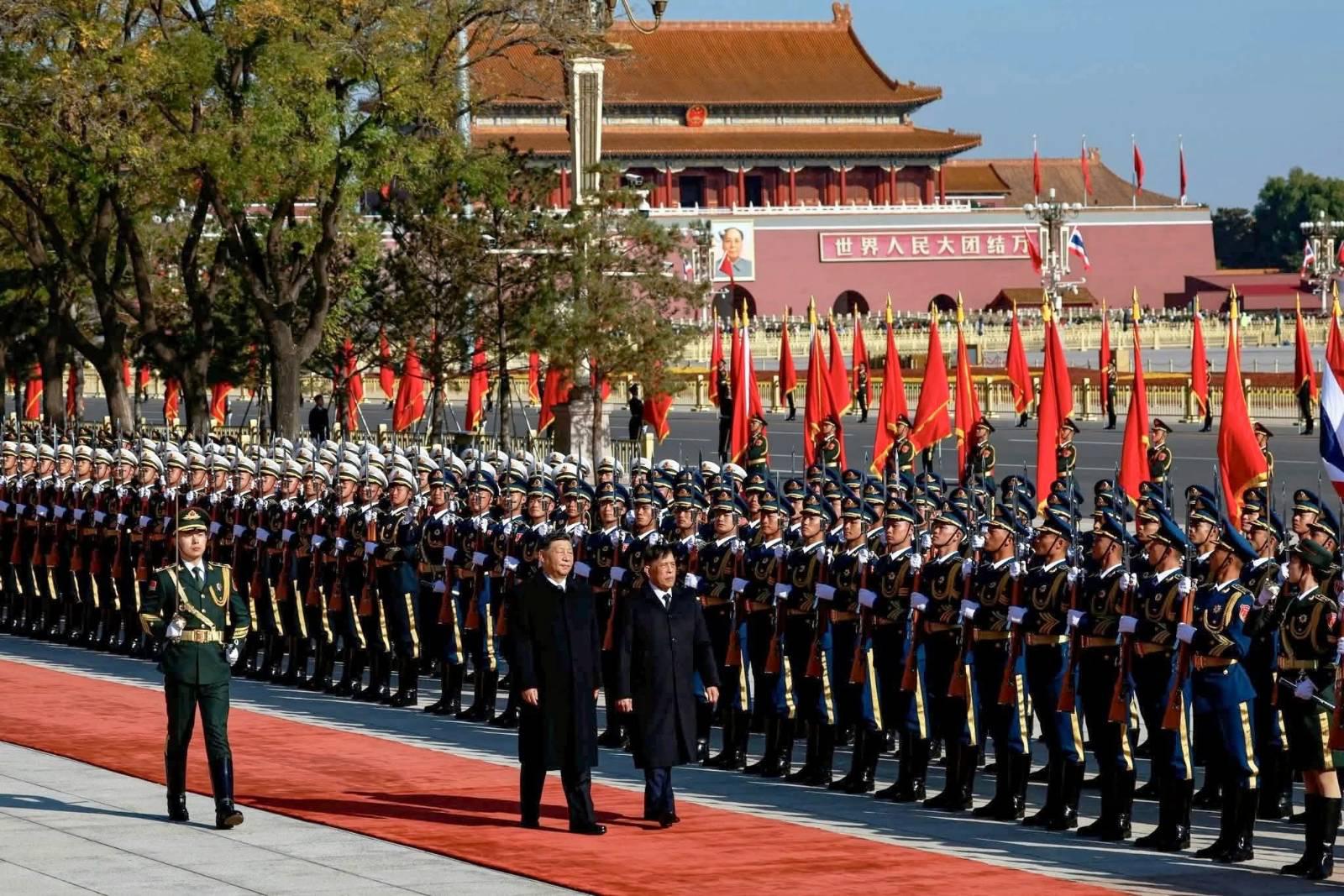 ประธานาธิบดี สีจิ้นผิง(เกิด 15 มิถุนายน ค.ศ. 1953) เป็นนักการเมืองชาวจีนผู้ดำรงตำแหน่งเลขาธิการใหญ่พรรคคอมมิวนิสต์จีน และ ประธานคณะกรรมาธิการการทหารกลางมสียังดำรงตำแหน่งประธานาธิบดีคนที่ 7 ให้การต้อนรับเสด็จ พิธีสวนสนาม อย่างยิ่งใหญ่