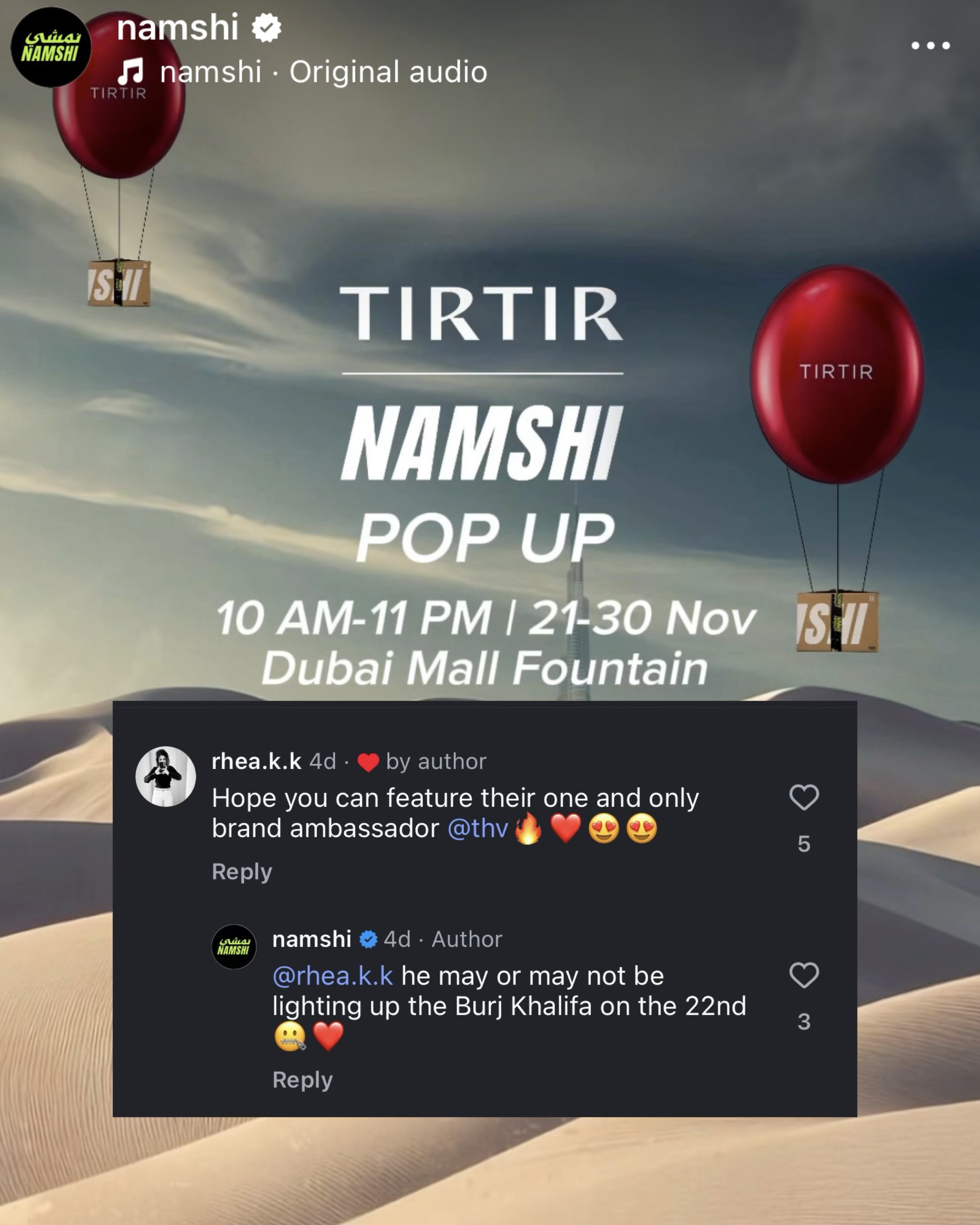นอกจากนี้ TIRTIR จะจัดงานป๊อปอัพ 10 วัน ณ น้ำพุ Dubai Mall Fountain ตั้งแต่วันที่ 21–30 พฤศจิกายน 2025