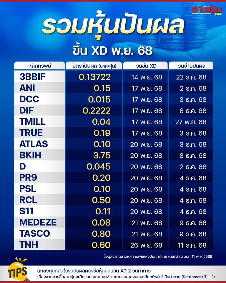เช็กลิสต์หุ้นปันผล ทยอยขึ้น XD เดือนพ.ย. 68