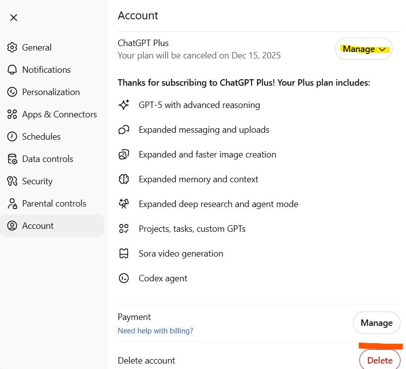 4. Account > ChatGPT Plus > Manage กดยกเลิก จะได้วันที่ยังเหลือใช้งาน ChatGPT แสดงอยู่