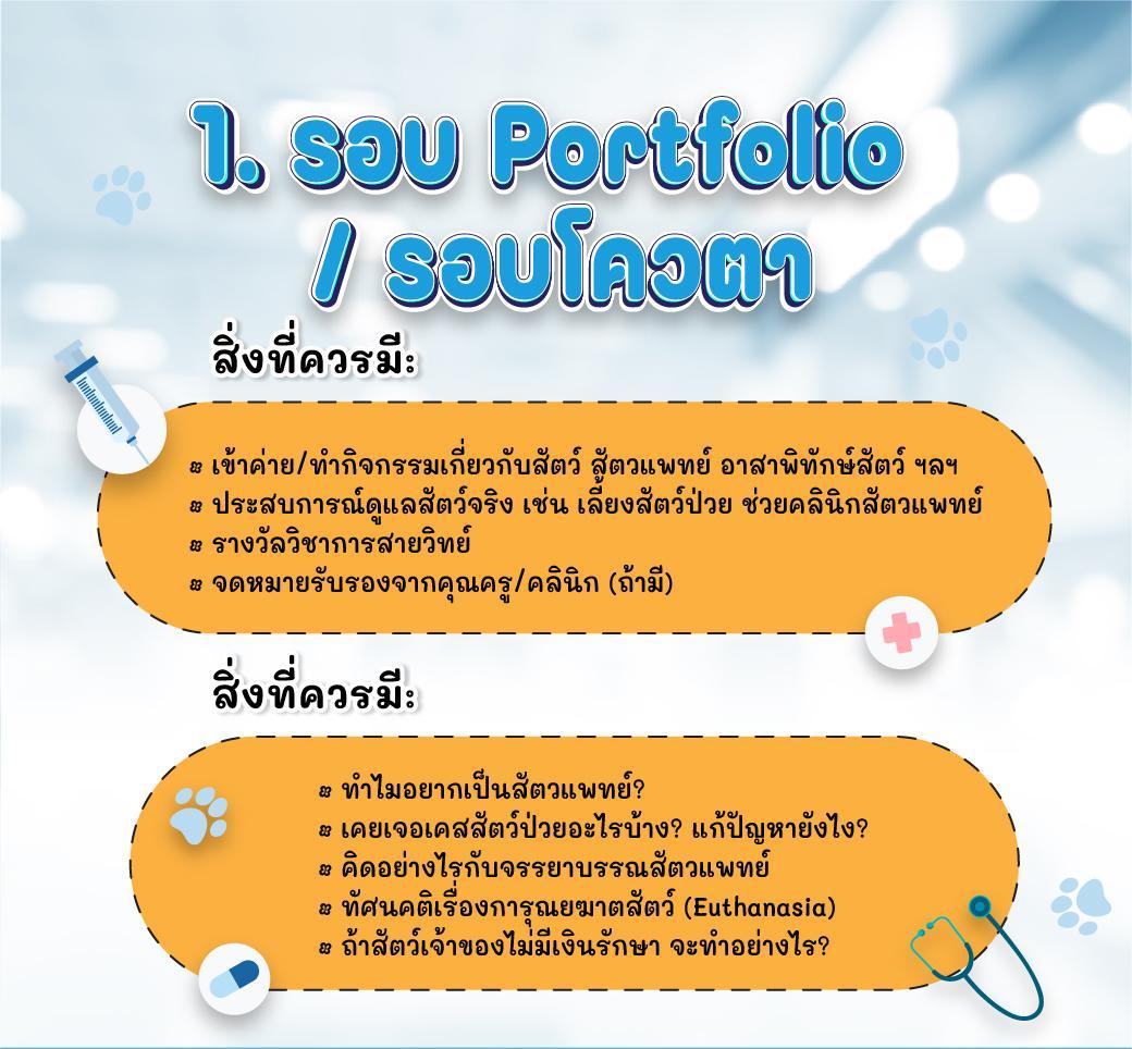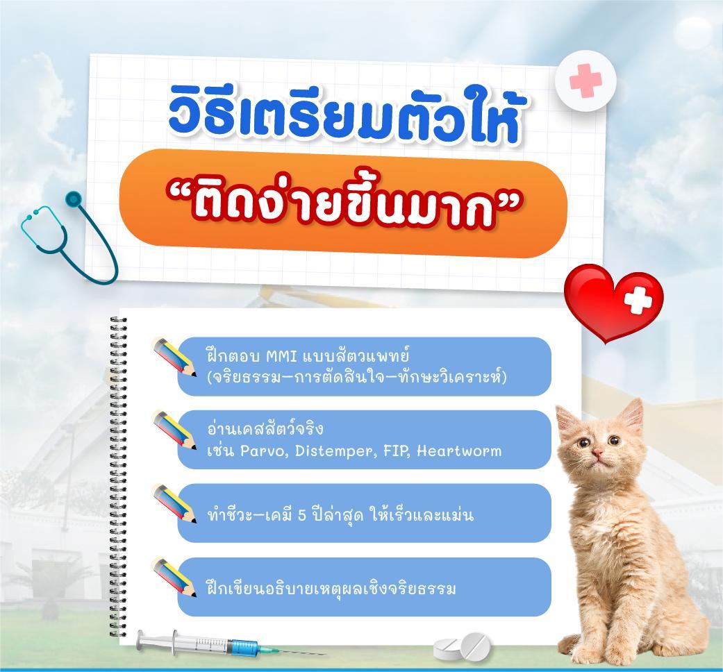 เส้นทางทั้งหมดประกอบด้วยเกณฑ์คุณสมบัติพื้นฐาน รายวิชาที่ใช้ในการคัดเลือก แนวข้อสอบที่ออกบ่อย รวมถึงการเตรียมตัวทั้งด้านเนื้อหาและผลงานที่ใช้ยื่นในแต่ละรอบ เหมาะสำหรับผู้ที่ต้องการเดินสายสัตวแพทย์แบบจริงจัง