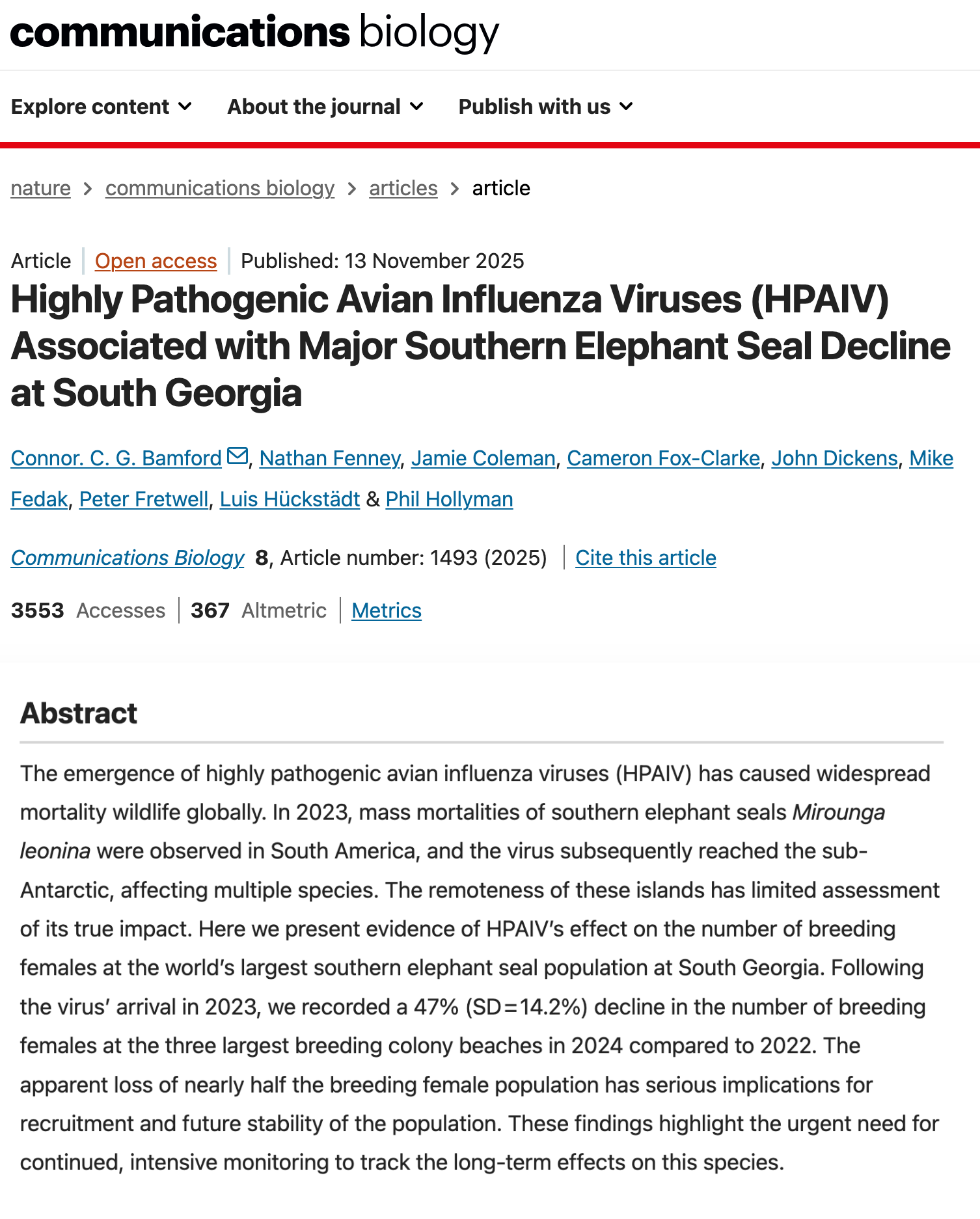 ไข้หวัดนกฆ่าแมวน้ำช้างตัวเมีย 50,000 ตัว