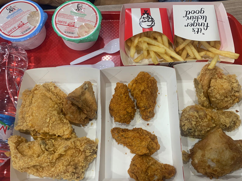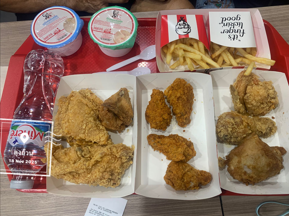 เปลี่ยนเรื่อง มากินไก่ทอด สั่งเป็นชุด มีส่วนลดพวกอาหารที่เสริมมา กิยน้ำเปล่าแทนน้ำอัดบม refill ลดน้ำตาลเป็นเบาหวานไปแล้ว ความดันก็สูง ยูริคก็สูง ยังกินไก่อีก