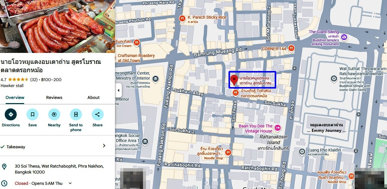ชื่อสินค้า: นายโอวหมูแดงอบเตาถ่าน, หมูแดงย่าง, หมูกรอบ, ซี่โครง, ปิ้งย่าง, อาหารย่าง, ตลาดตรอกหม้อ, เขตพระนคร, กทม., กรุงเทพฯ, กรุงเทพมหานคร