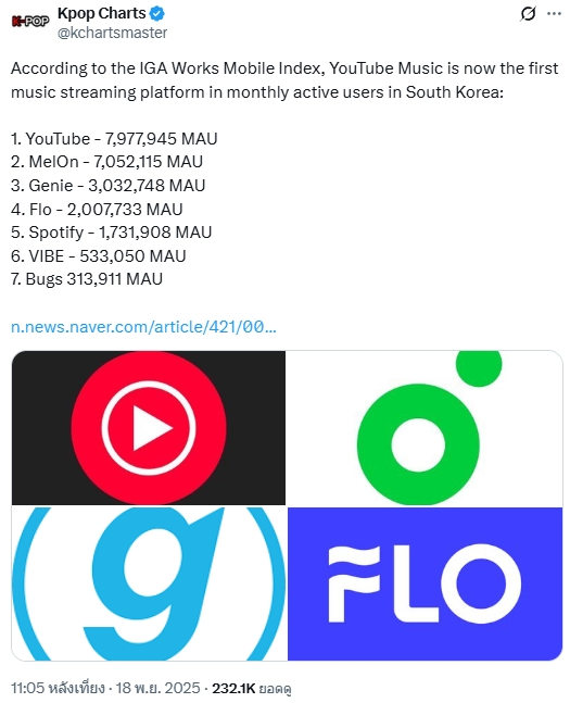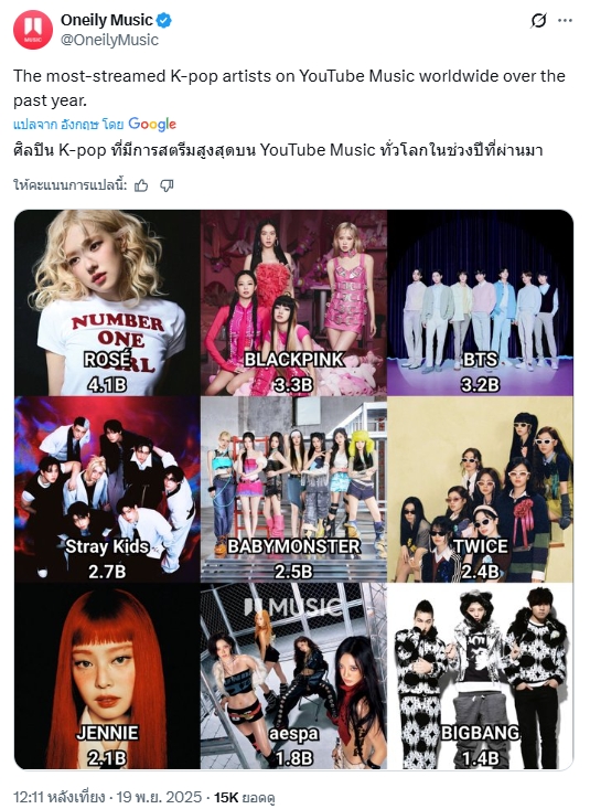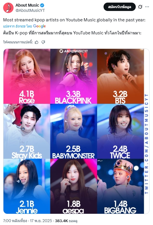 🔥 Stray Kids เป็น K-pop อันดับ1เจน4 ที่สตรีมมากสุดไม่ใช่แค่เกาหลีแต่เป็นทั่วโลก บน Youtube Music ในช่วง 12 เดือนที่ผ่านมา ที่ 2,700 ล้านครั้ง