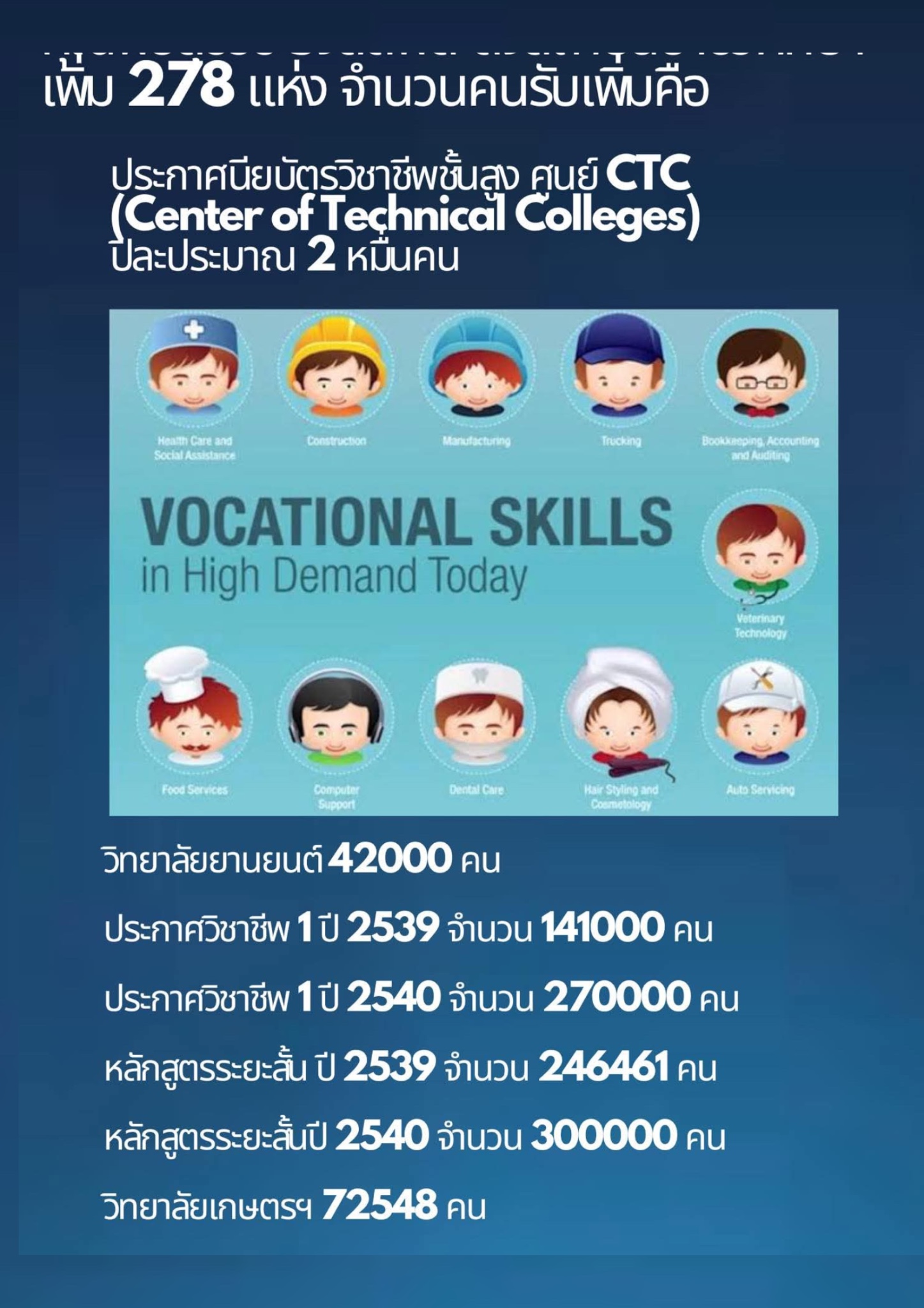 ภายใต้การปฏิรูปดังกล่าว ได้มีการจัดตั้งสถาบันอาชีวศึกษาใหม่ 278 แห่ง รวมถึงการยกระดับโรงเรียนเกษตรกรรมเป็นวิทยาลัยเกษตรและเทคโนโลยี การขยายตัวของสถาบันเหล่านี้ช่วยรองรับผู้เรียนสายอาชีพและก่อให้เกิดการผลิตบุคลากรกว่า 2 ล้านคน พร้อมทั้งวางรากฐานให้ประเทศไทยสามารถพัฒนาระบบ DVT ได้อย่างเป็นระบบและยั่งยืน ช่วยให้ภาคอุตสาหกรรมเข้าถึงแรงงานทักษะสูงได้มากขึ้น