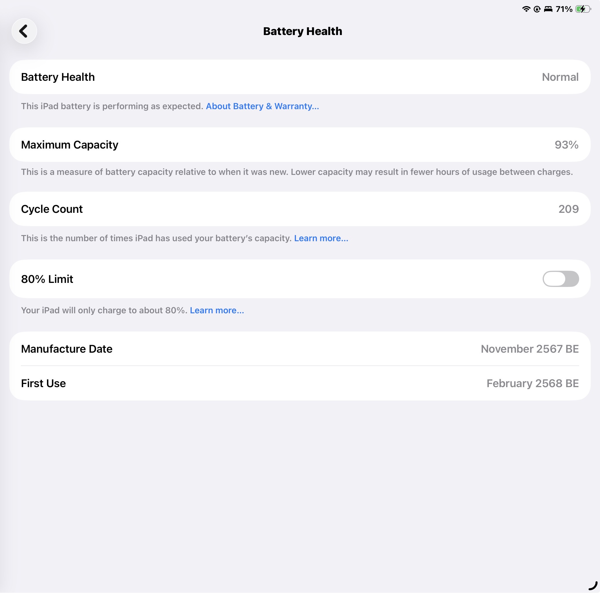 สวัสดีค่ะ ตอนนี้หนูใช้ไอแพดแอร์หก 13 นิ้ว อยากทราบว่าสุขภาพแบตไอแพดลดเร็ว จาก 100% ถึง 93 % ภายในเวลาไม่ถึงปีปกติมั้ยคะ หนูใช้ไอแพดเรียนและเล่นเกมบ้าง มีช่วงนึงติดโรบ้อคมากค่ะ เล่นทุกวันตั้งแต่เย็น ๆถึง ตีหนึ่งตีสองของอีกวัน แต่เป็นแบบนี้ไม่บ่อยค่ะ อาทิตย์สองอาทิตย์ก็เลิกแล้ว จากนั้นก็ไม่มีอะไรเลยค่ะ ใช้งานตามปกติ ดูหนัง ฟังเพลงบางครั้ง หรืออาจจะเพราะชาร์จบ่อยด้วมั้ยก็ไม่แน่ใจเพราะไม่เคยปล่อยให้แบตไอแพดตํ่ากว่า 20 % เลยค่ะ กังวลมาก ๆเพราะซื้อมาไม่ถึงปี