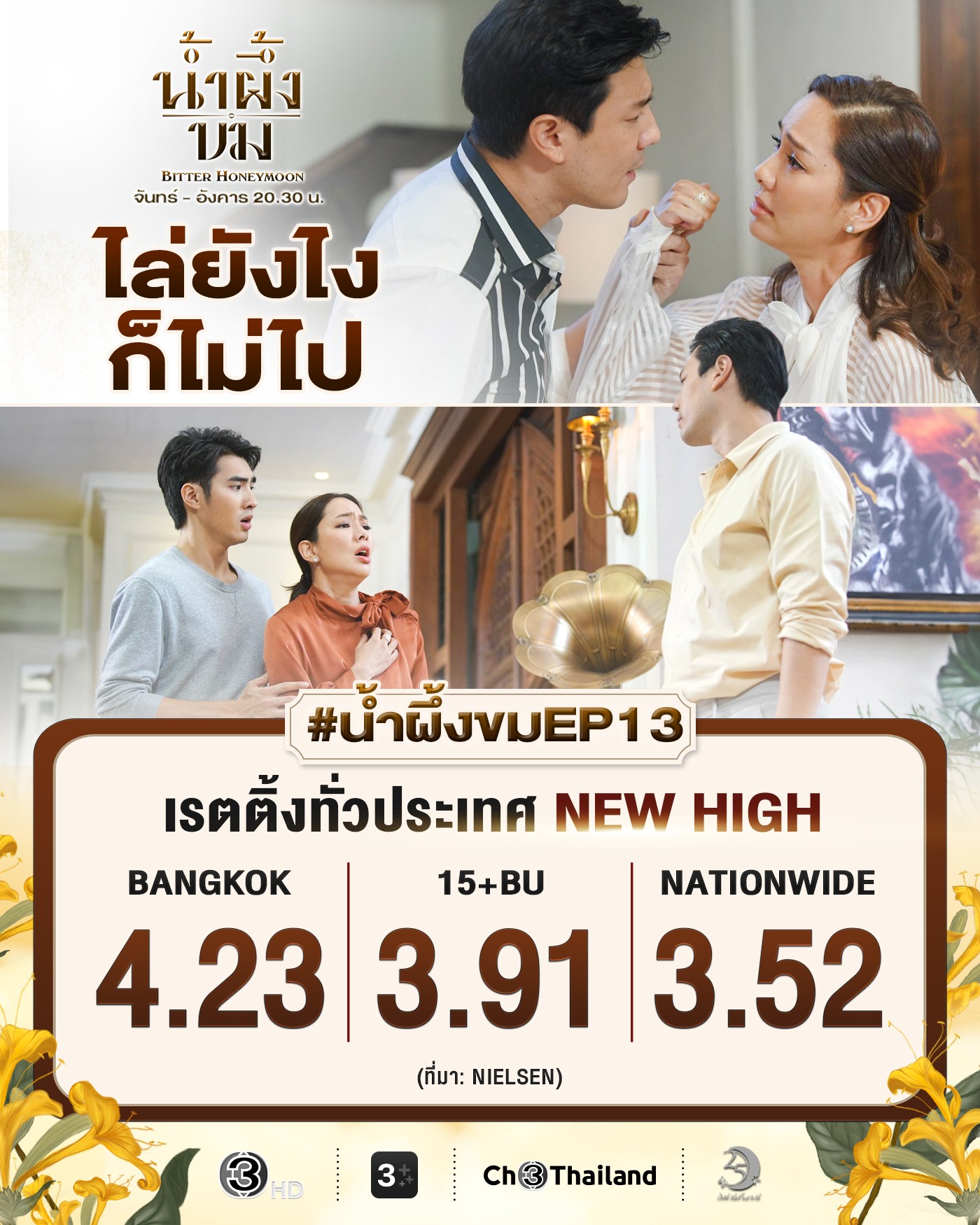 📌 เรตติ้งละคร "น้ำผึ้งขม" EP.13 เรตติ้งกรุงเทพฯ 4.23 / เรตติ้ง 15+ BU 3.91 / เรตติ้งทั่วประเทศ 3.52 ทำ New High !!! 🎉