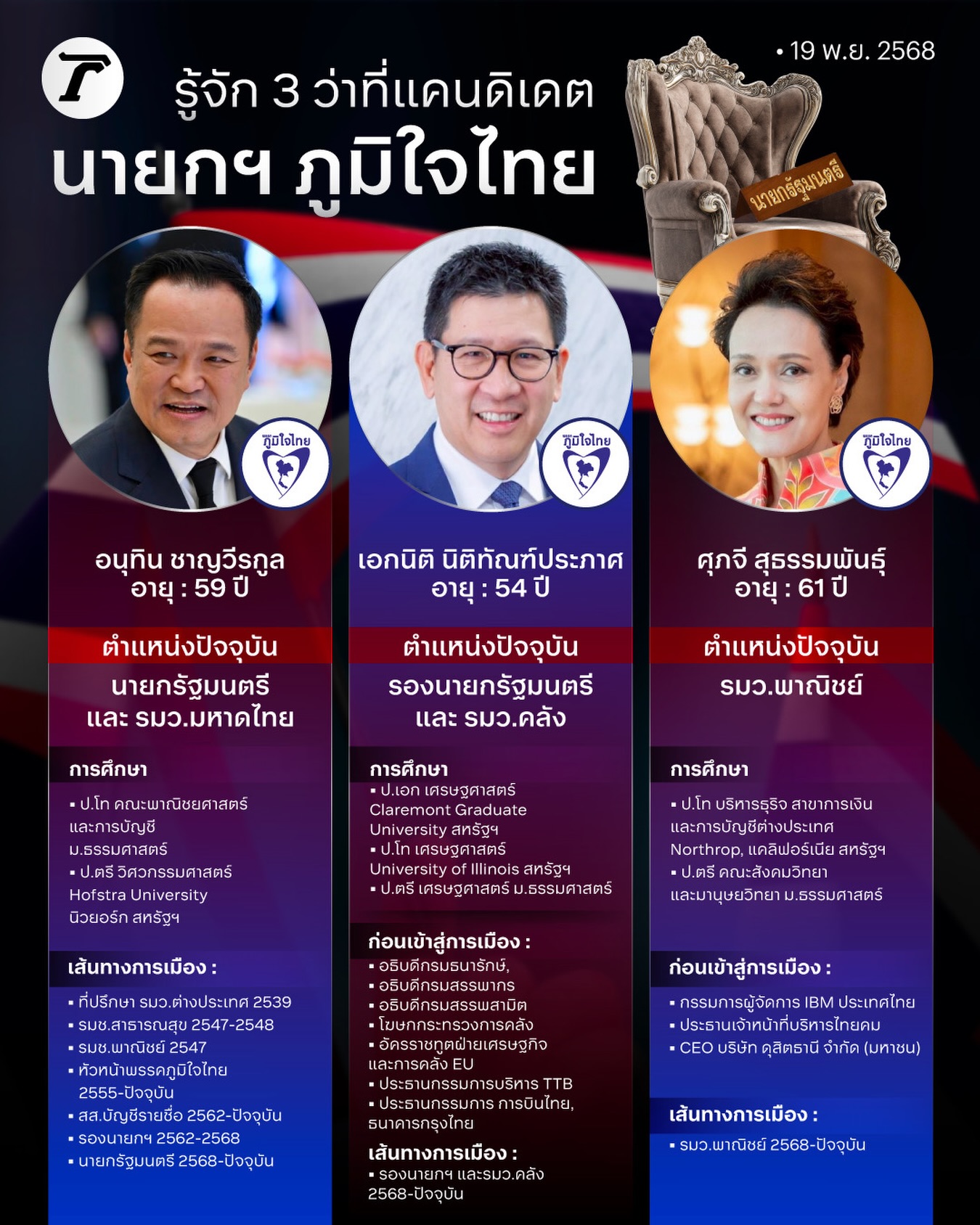 รู้จักว่าที่ 3 แคนดิเดตนายกฯ #พรรคภูมิใจไทย นอกจาก “อนุทิน” หัวหน้าพรรคและนายกฯ คนปัจจุบันแล้ว วันนี้ (19 พ.ย.) แง้ม อีก 2 คน คือ “เอกนิติ” และ “ศุภจี” 2 รัฐมนตรีโควตาคนนอกของรัฐบาลชุดปัจจุบัน โดยทั้งคู่ยังไม่ยืนยันว่าจะรับหรือไม่ 🤔