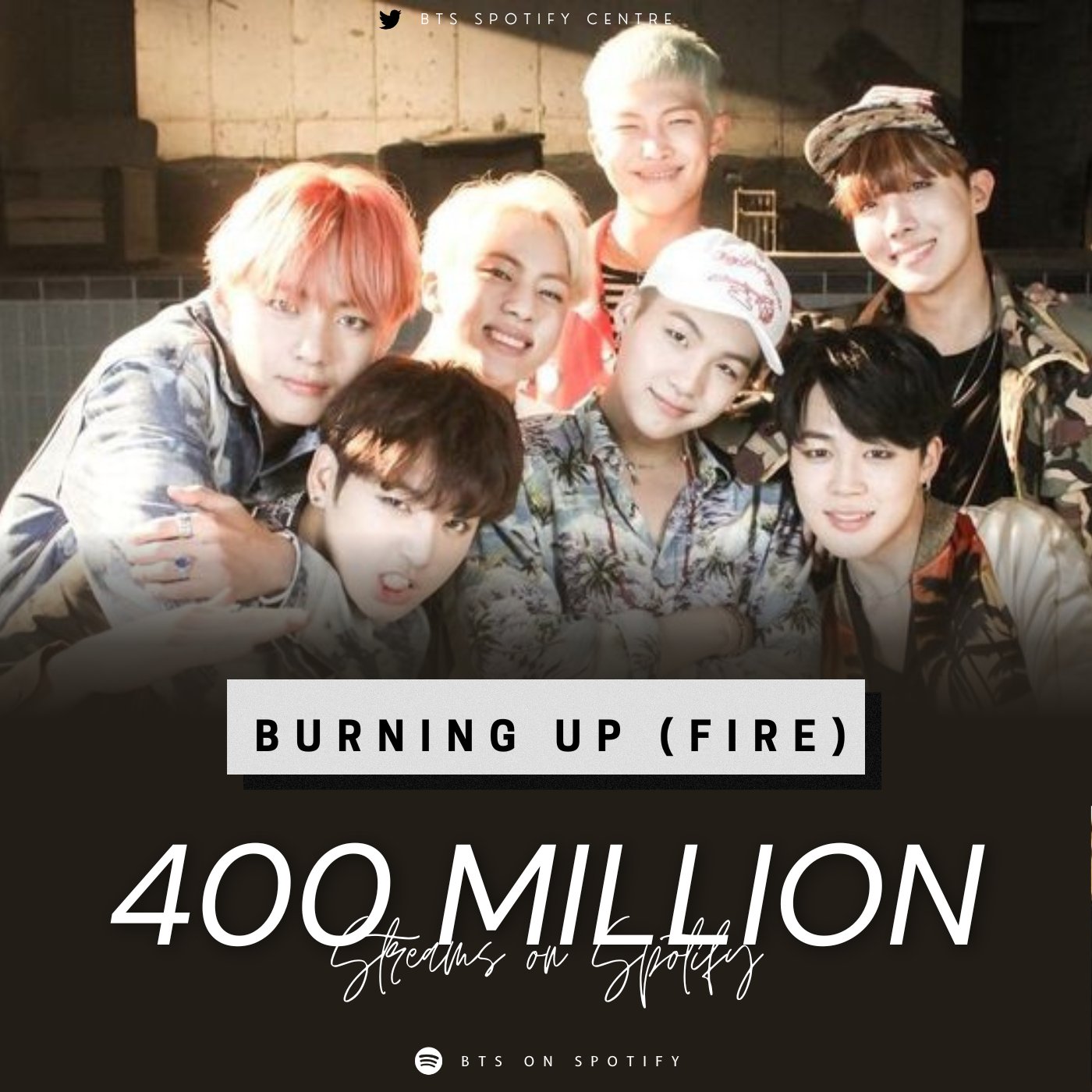 🔥 "FIRE" by BTS มียอดสตรีมทะลุ 400 ล้าน บน Spotify 🎉 เป็นเพลงที่ 25 ของวง BTS ที่บรรลุเป้าหมายนี้