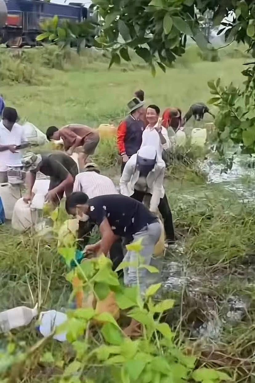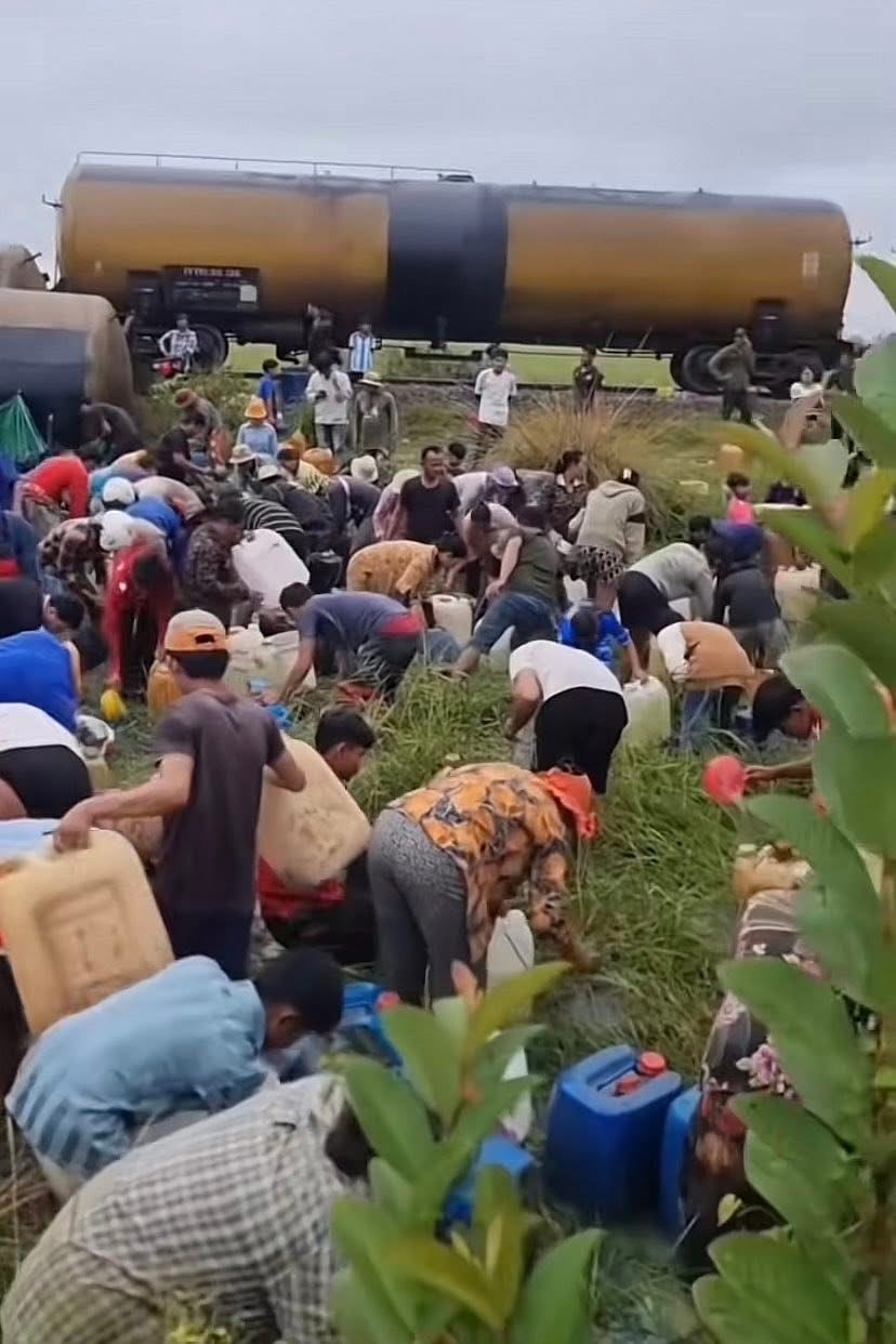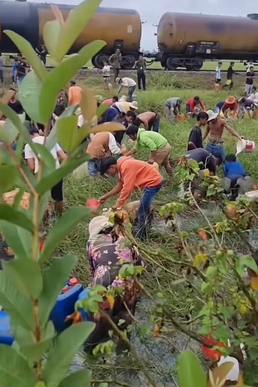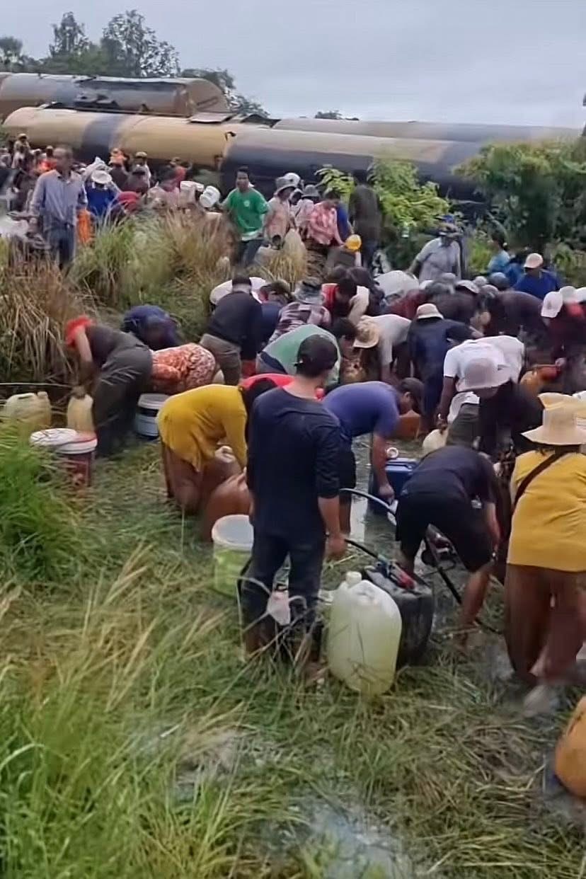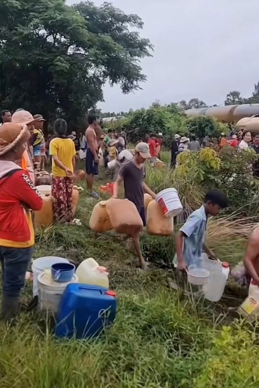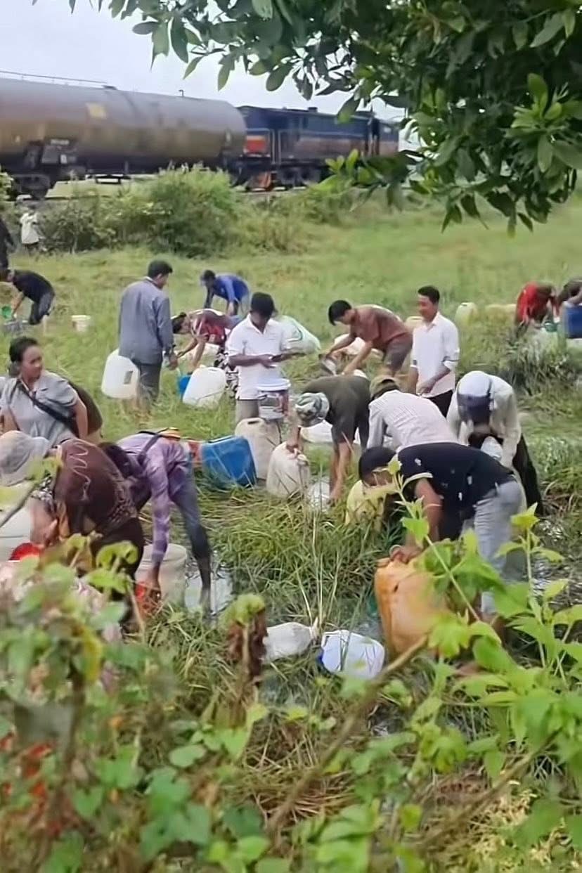 ชาวเขมรแห่กันเข้ามาตักน้ำมันที่รั่วไหลลงมาข้างทางรถไฟจนกลายเป็นบึง