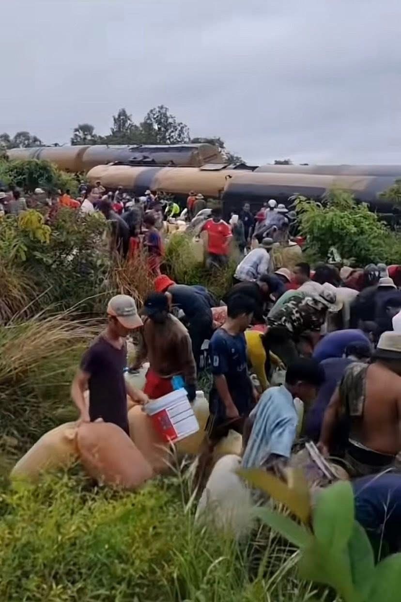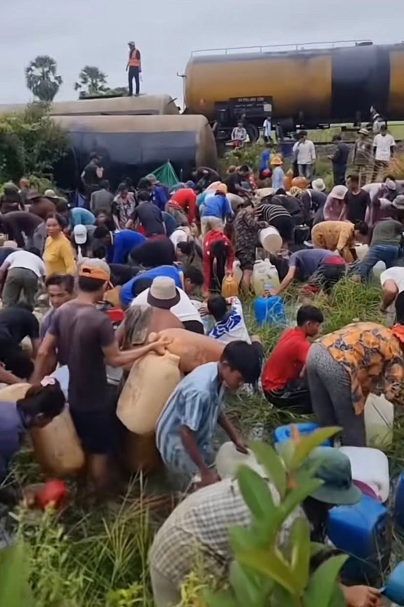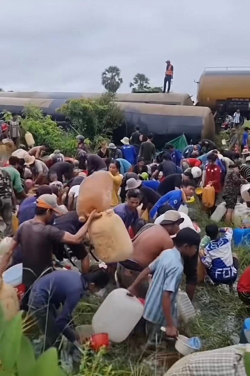 เกิดเหตุรถไฟขนน้ำมันตกรางที่จังหวัดโพธิสัตว์“ ชาวเขมร ”แห่กันเข้ามาตักน้ำมันที่รั่วไหลลงมาข้างทางรถไฟจนกลายเป็นบึง