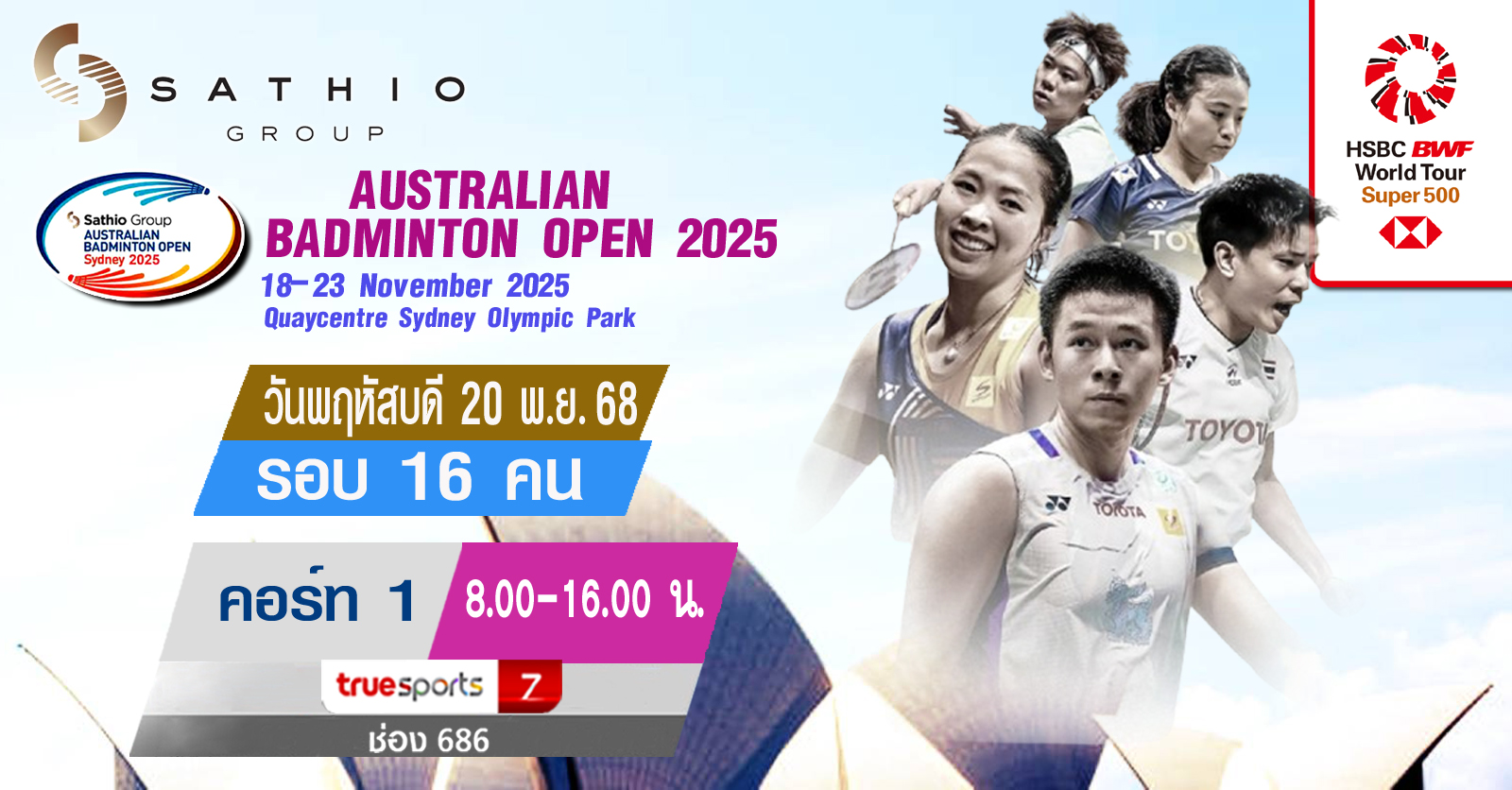 เชียร์สด ! แบดมินตัน SATHIO GROUP Australian Open 2025 : รอบ 16 คน (20 พ.ย. 68) (คู่แรก 8.00 น.)